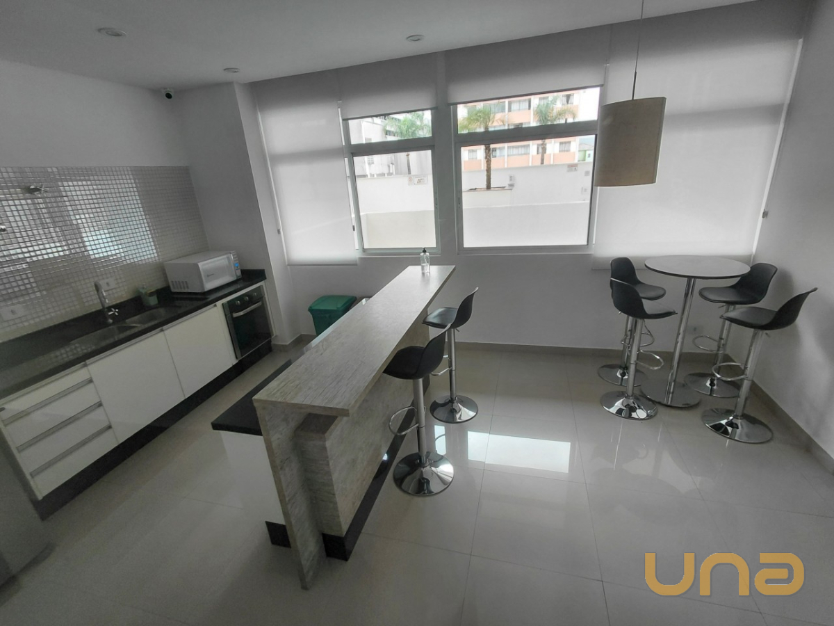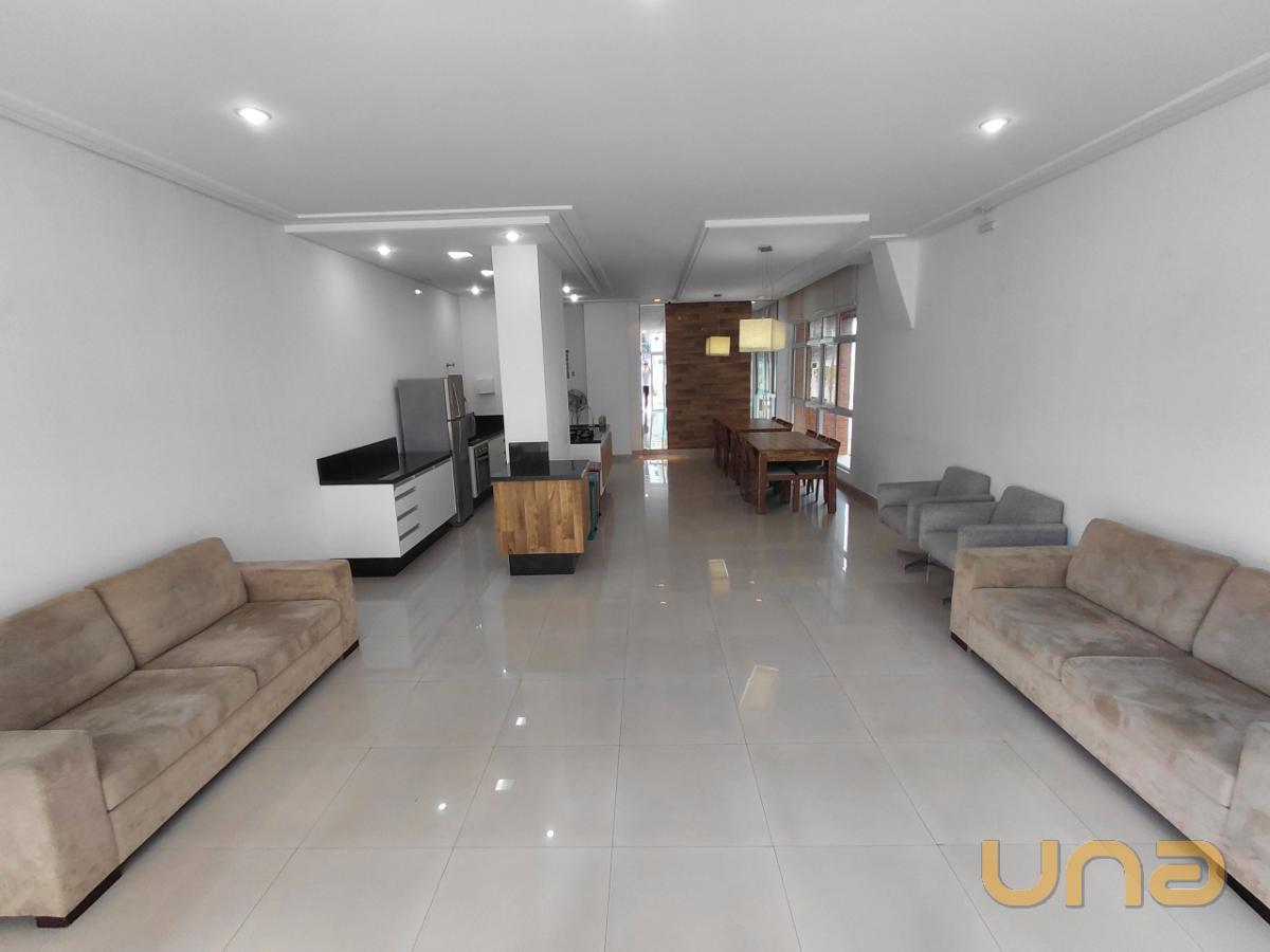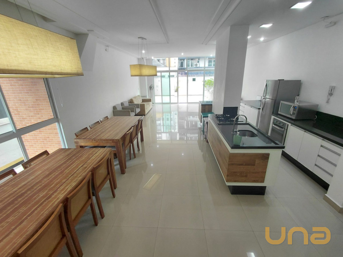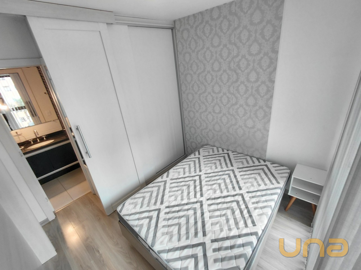 O imóvel com 01 dormitório equipado com armário embutido e painel para TV, cozinha integrada com armários planejados, micro-ondas, geladeira e lavadora de roupas. A sala possui painel e TV, sofá e mesa com quatro cadeiras, banheiro está equipado com chuveiro a gás, box em blindex e espelho.