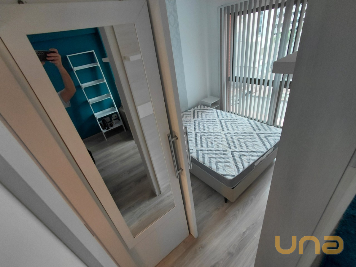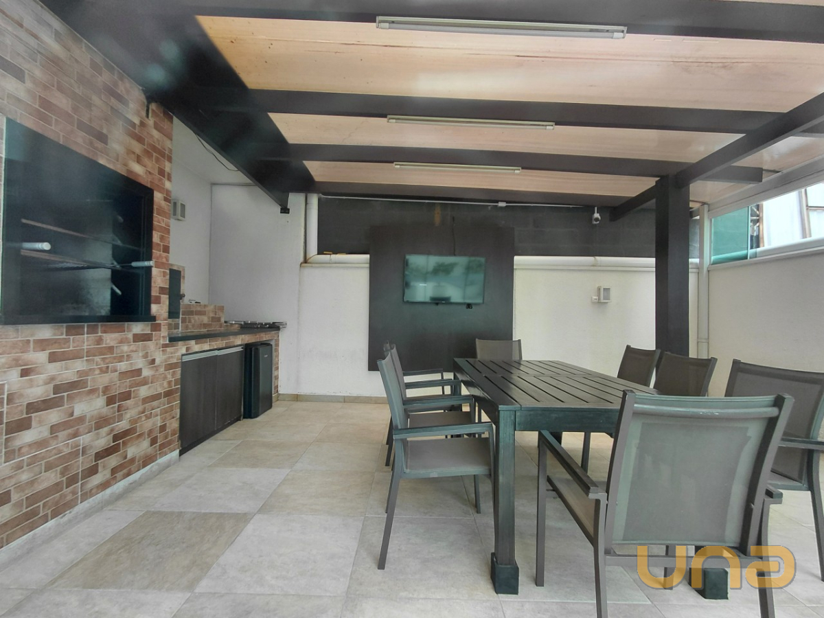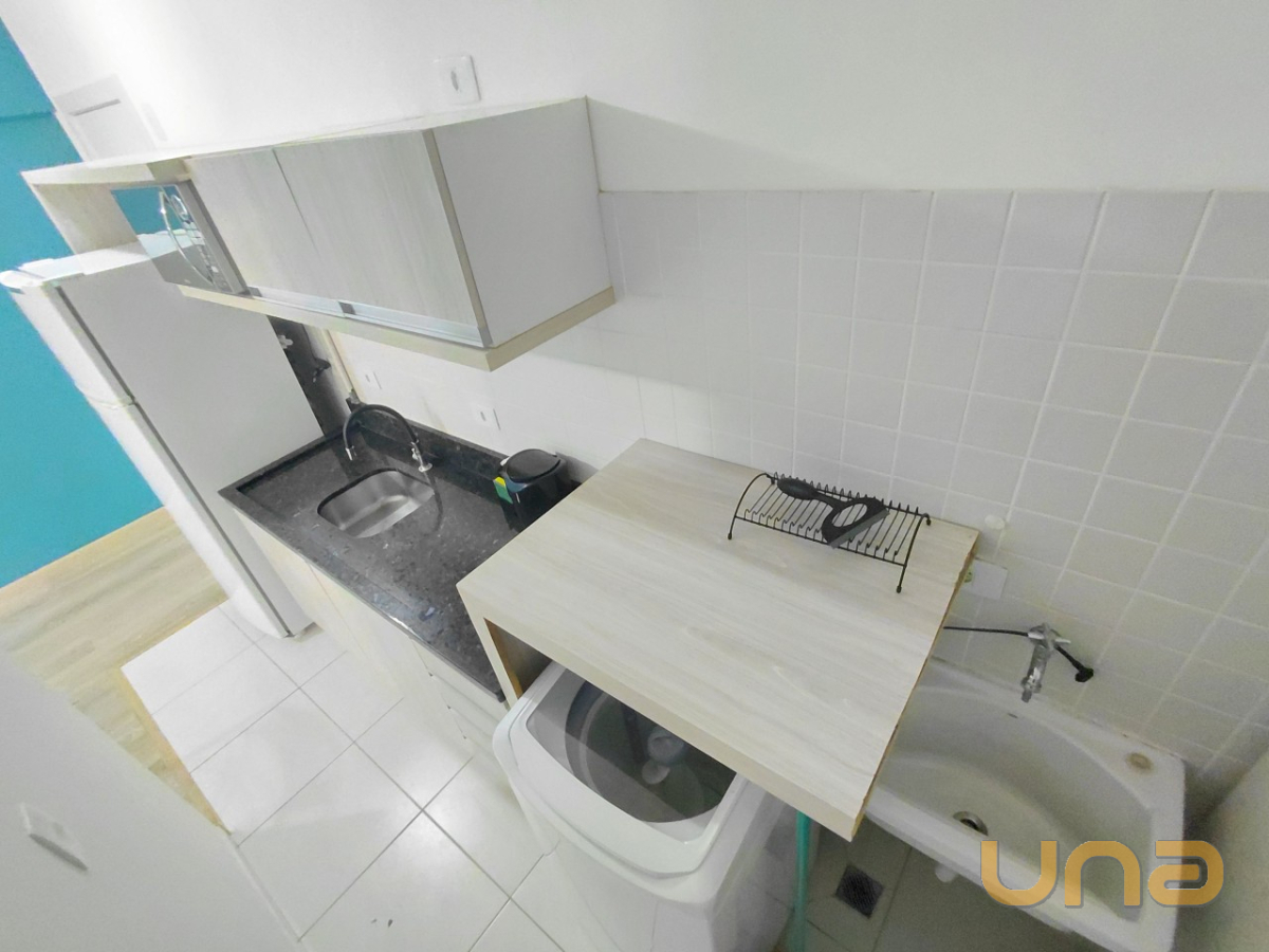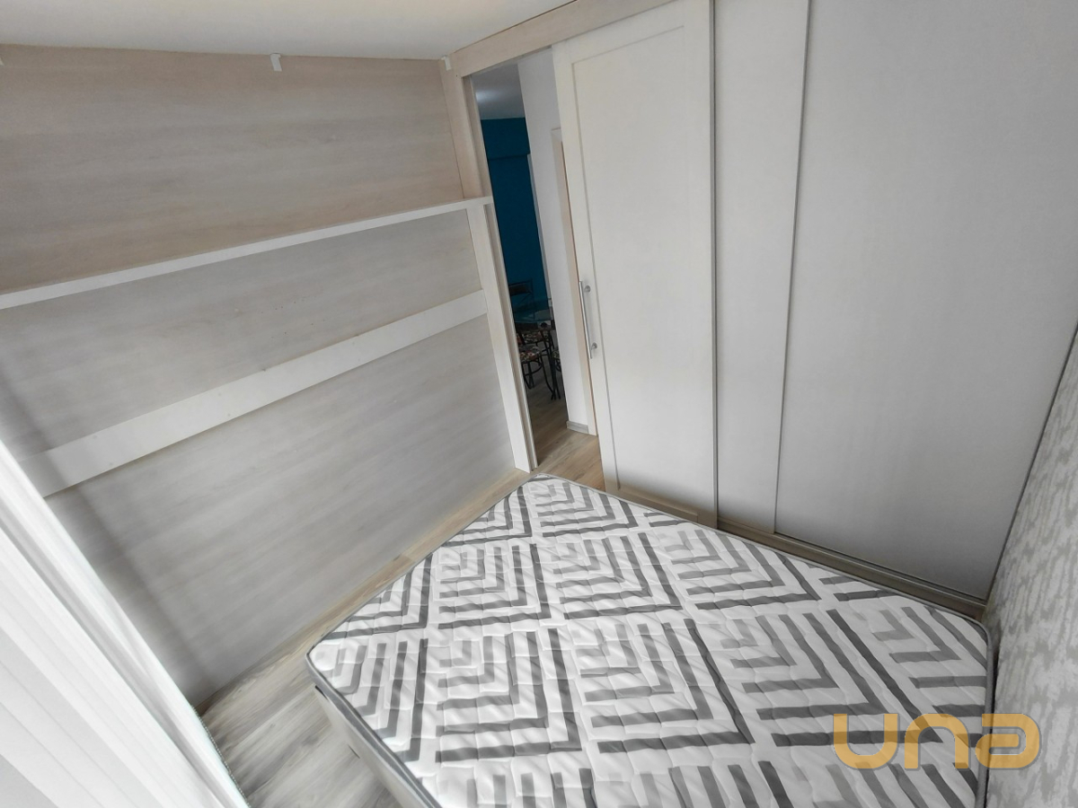 O imóvel com 01 dormitório equipado com armário embutido e painel para TV, cozinha integrada com armários planejados, micro-ondas, geladeira e lavadora de roupas. A sala possui painel e TV, sofá e mesa com quatro cadeiras, banheiro está equipado com chuveiro a gás, box em blindex e espelho.