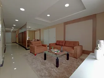 02 QUARTOS SENDO 01 COM ARMÁRIO 04 PORTAS, SUPORTE PARA TELEVISÃO E CORTINAS. 01 SUÍTE COM ESCRITÓRIO INTEGRADO, CLOSET E CORTINAS. BWC PRIVATIVO E BWC SOCIAL COM BOX EM VIDRO TEMPERADO, ARMÁRIO PLANEJADO E TAMPO EM GRANITO.