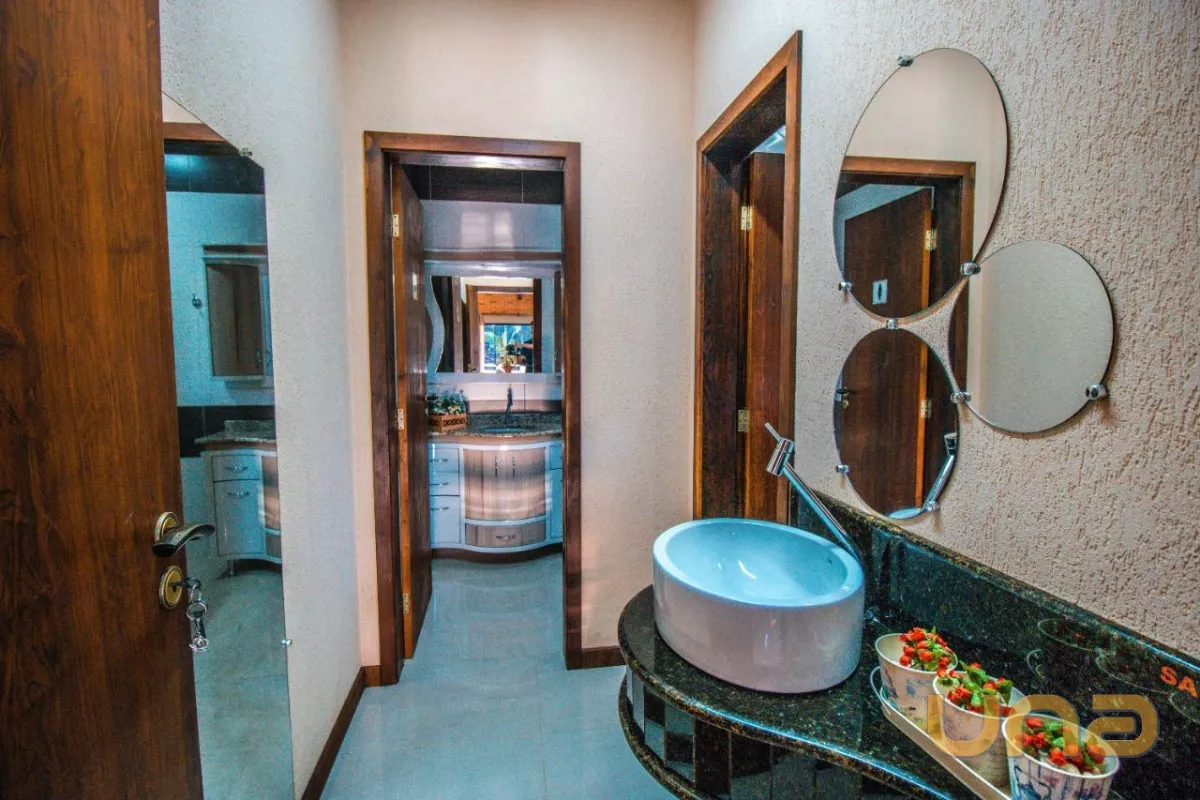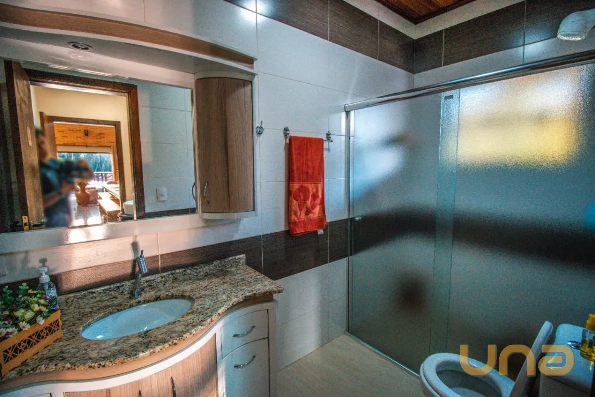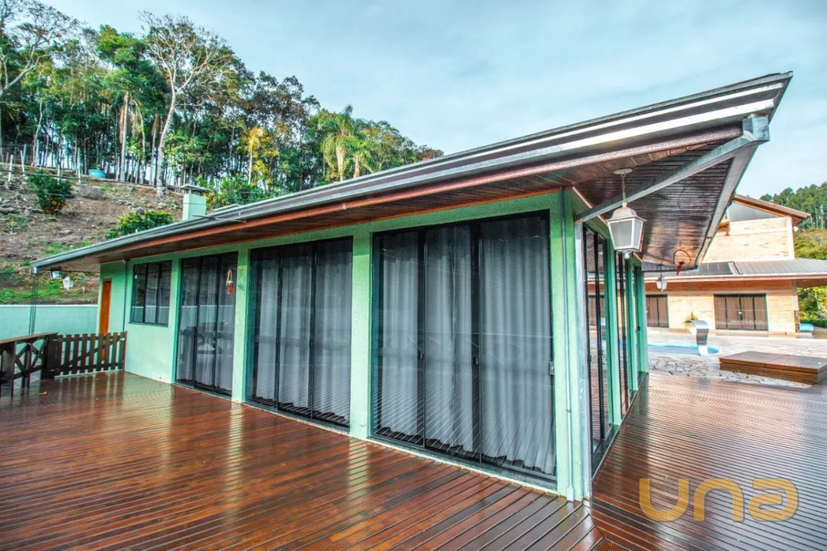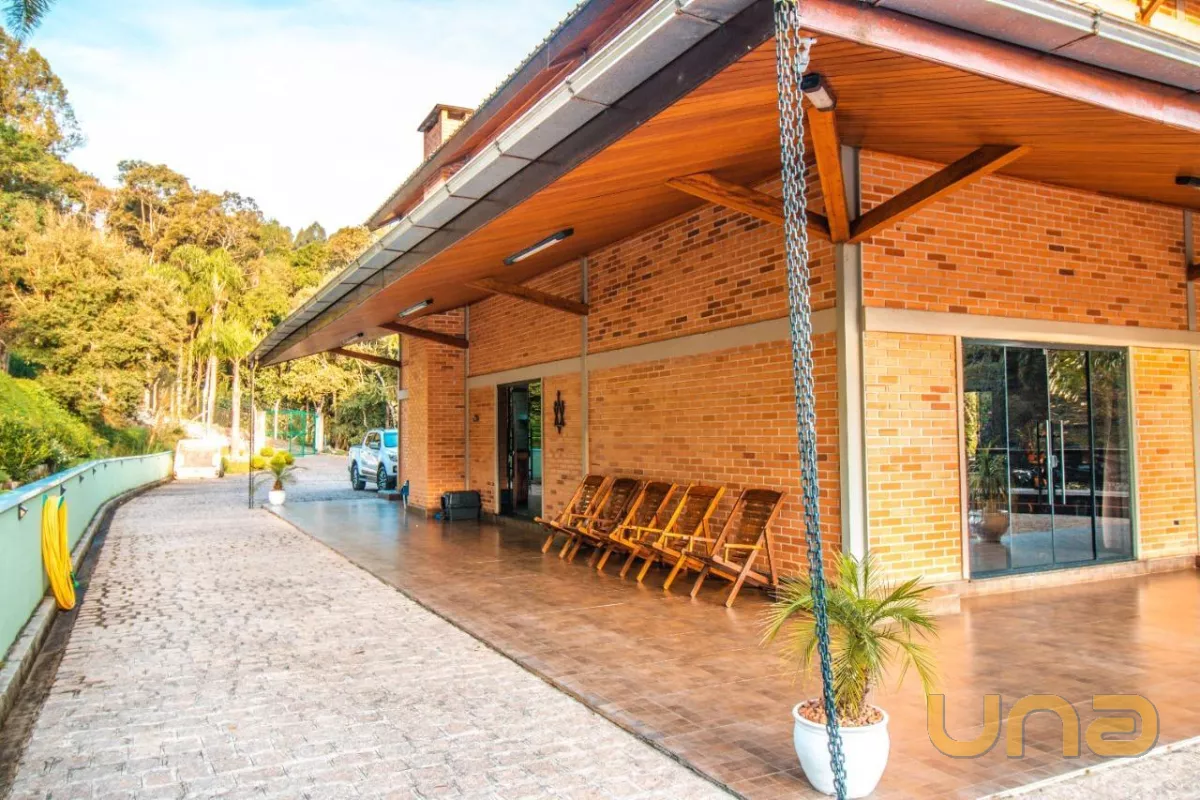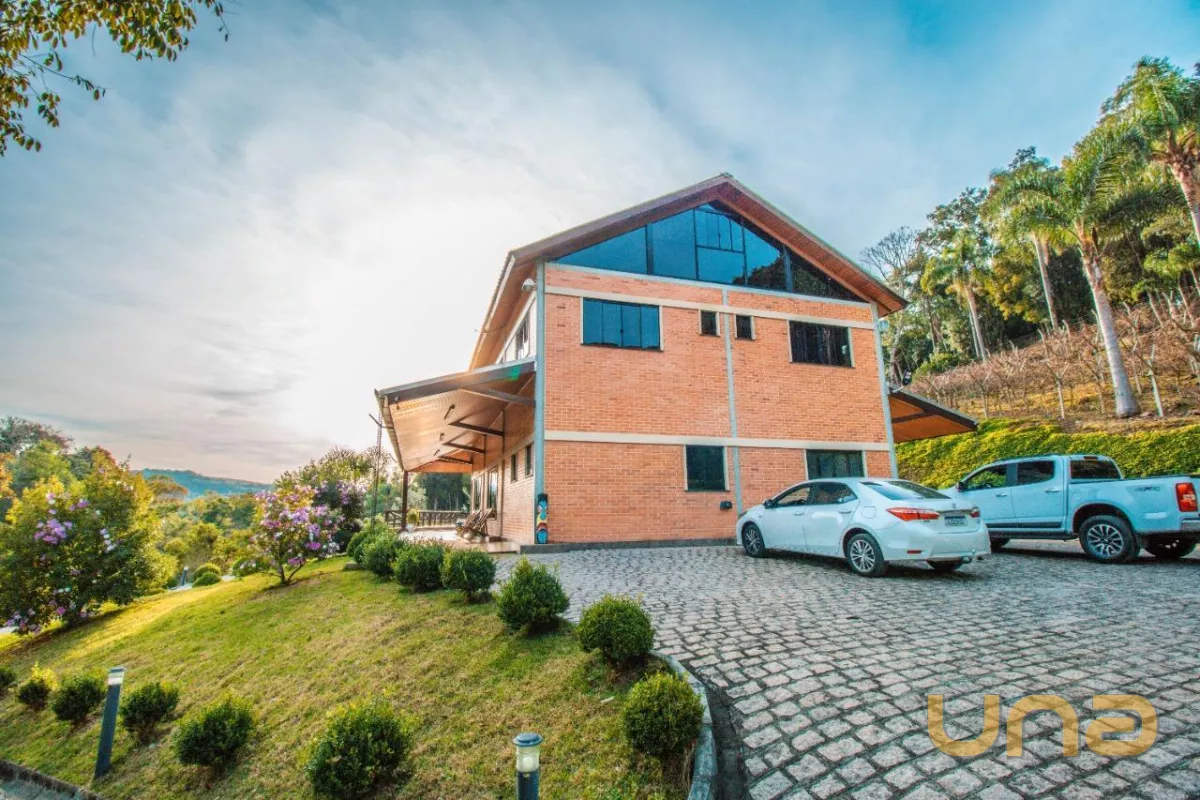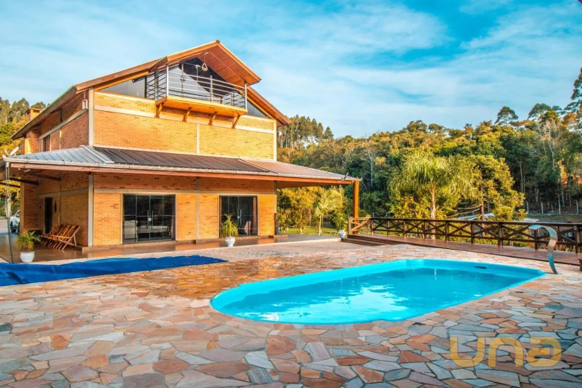 A casa sede com aproximadamente 540 m² possui três pavimentos, no primeiro andar você encontra as salas de estar e jantar em plano aberto e integradas com a cozinha, além da área de serviço. Conta com 4 quartos espaçosos, bem iluminados e arejados. No terceiro e último andar temos um ático que serve como área de lazer e descanso e proporciona uma vista linda do terreno e arredores. No primeiro pavimento, as portas-janelas te levam diretamente para a piscina, para seus dias de lazer.