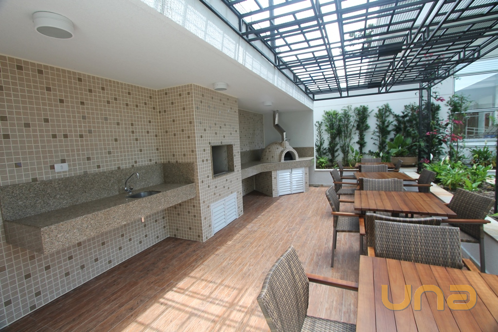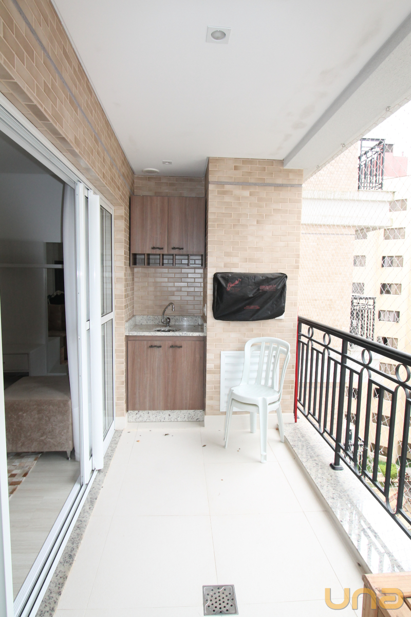 Sacada equipada com churrasqueira elétrica, pia, armários e mesa com cadeiras