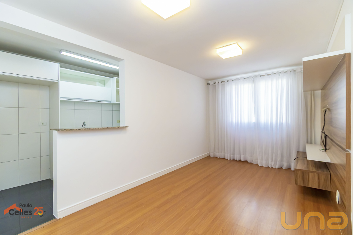 Ambientes com piso laminado, luminárias e cortinas instaladas em todo o apartamento.