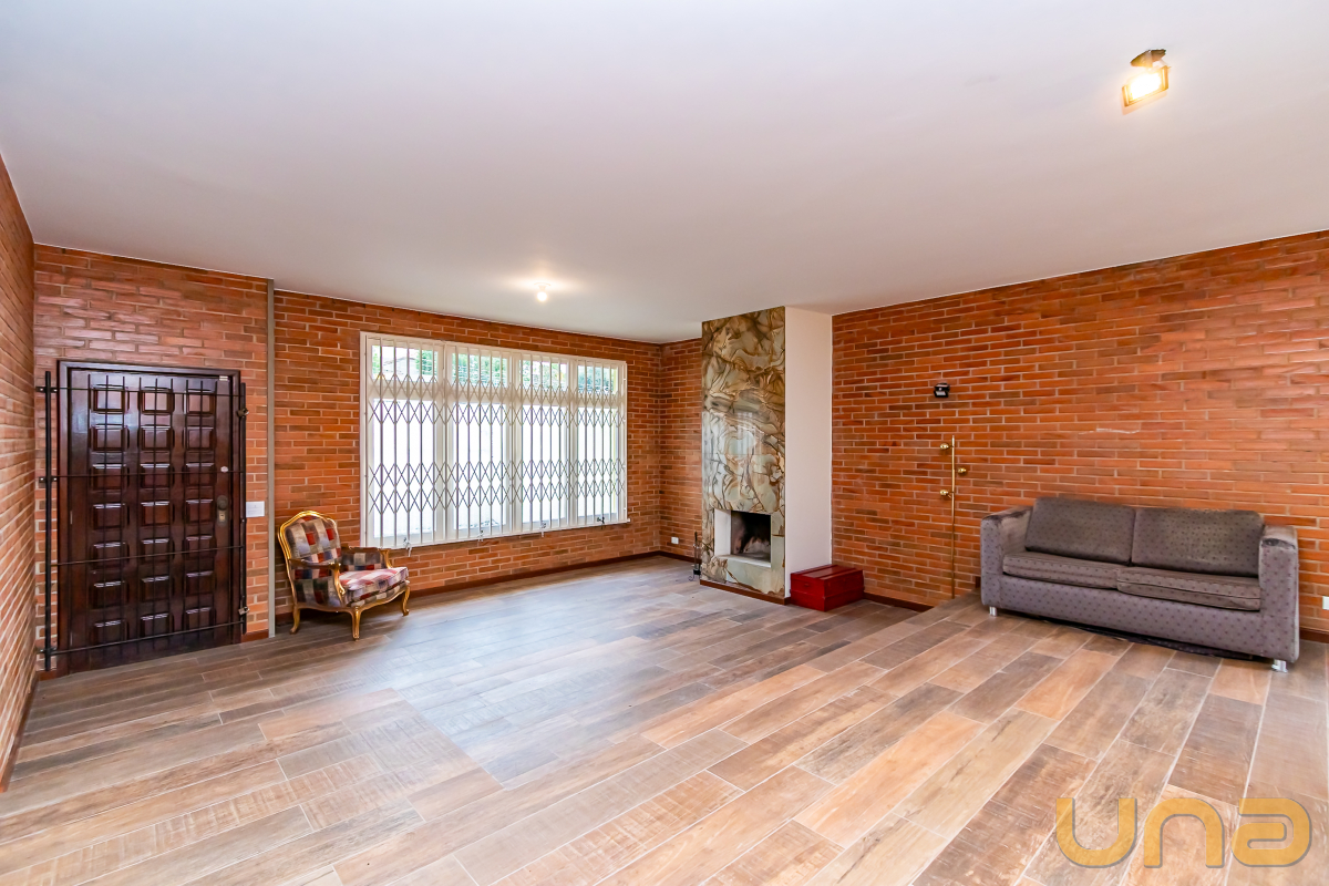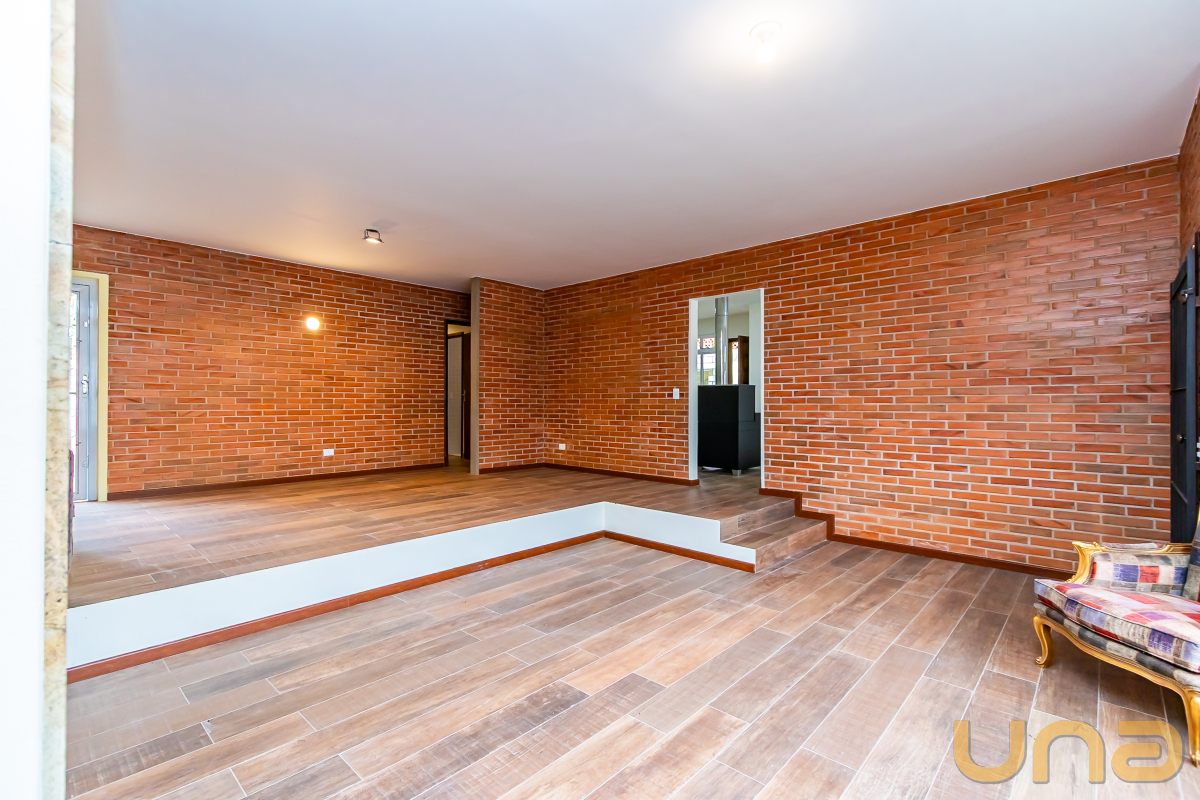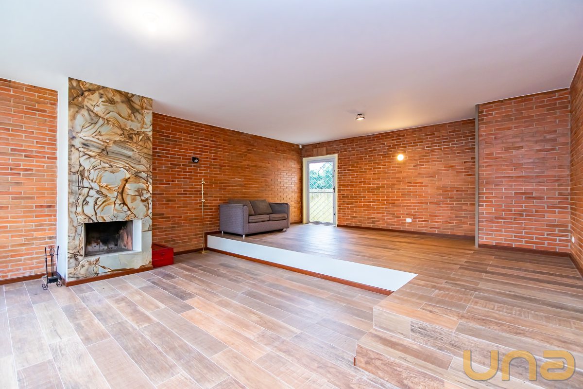 Living maravilhoso, em desnível, com lareira e parte da parede revestida em tijolinho.