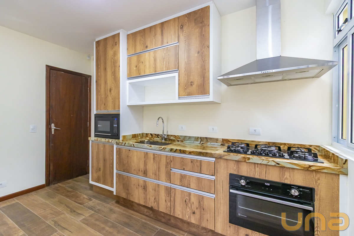 Cozinha estendida para a copa, com armários novos e um charmoso fogão a lenha com forno.