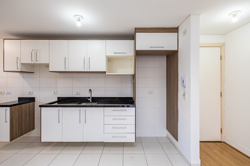 *Cozinha com armários planejados, pia com tampo em granito, conjugada com área de serviço com tanque e armário,