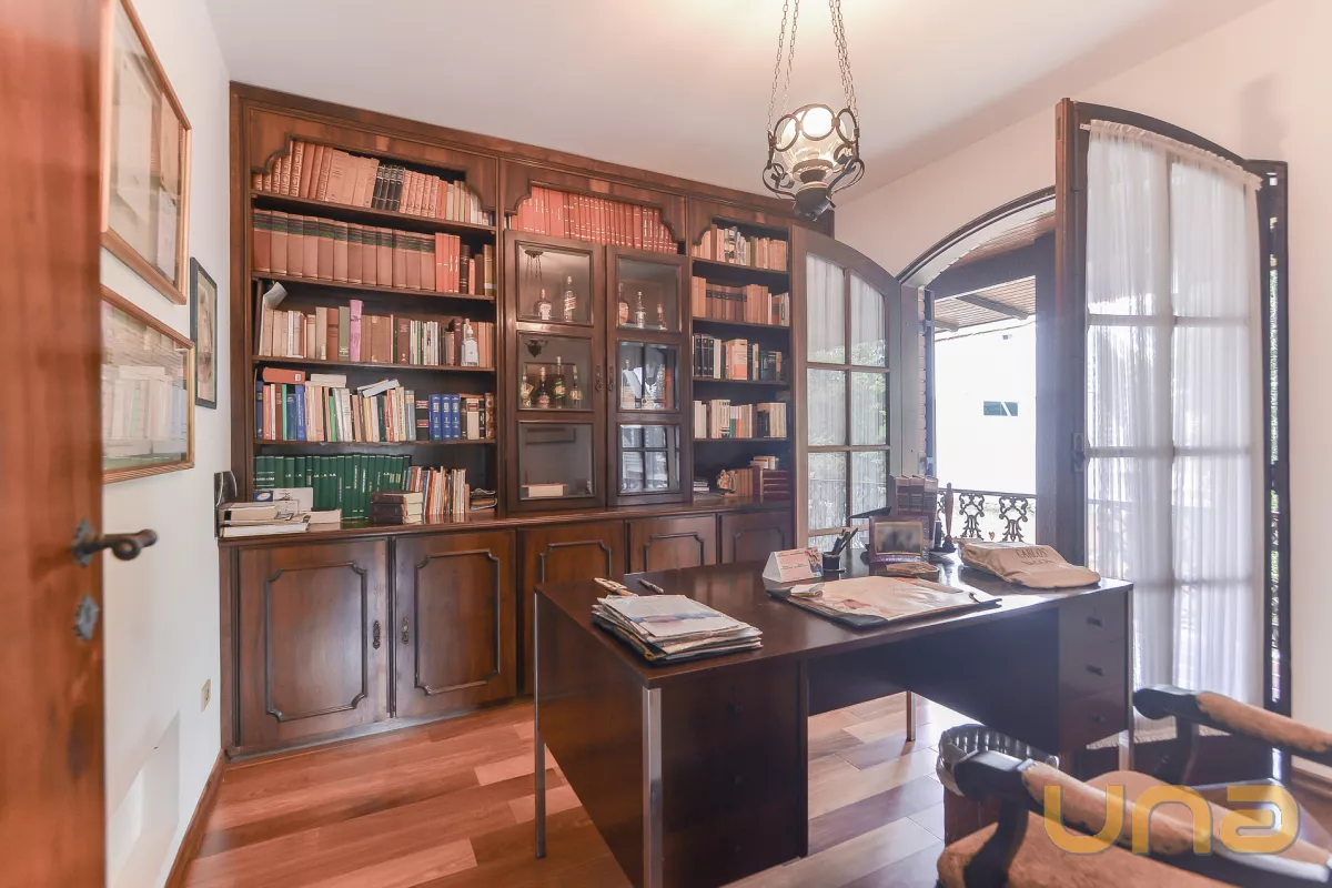 Praticamente térrea, sendo hall de entrada, lavabo, sala de estar com varanda, sala de jantar, estar íntimo com lareira, escritório, suíte principal com closet, cozinha, despensa, e dependência completa de empregada.