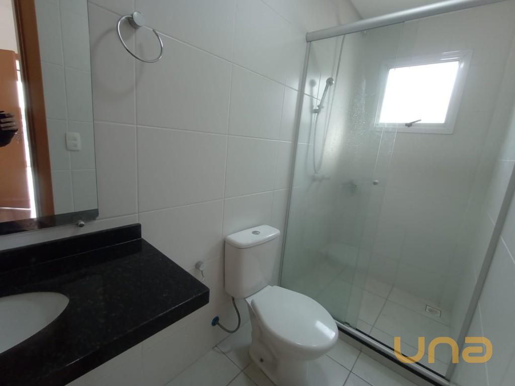 * Banheiro com box em vidro e espelho.