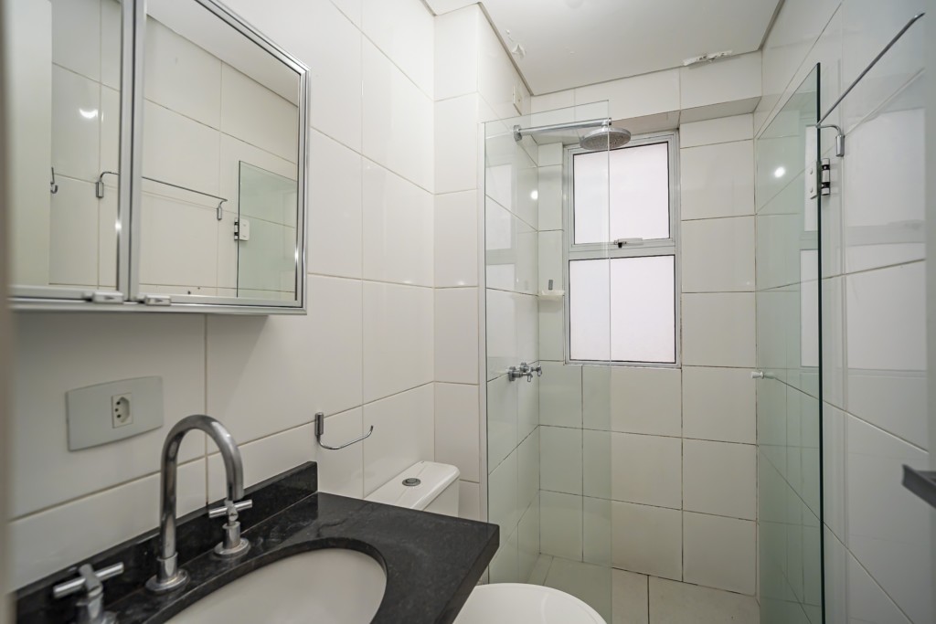 * 01 Banheiro revestido em azulejo, com pia em granito e box em vidro.