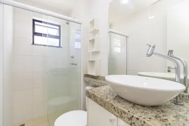 01 Bwc social com box em vidro, armário com a pia sobreposta.