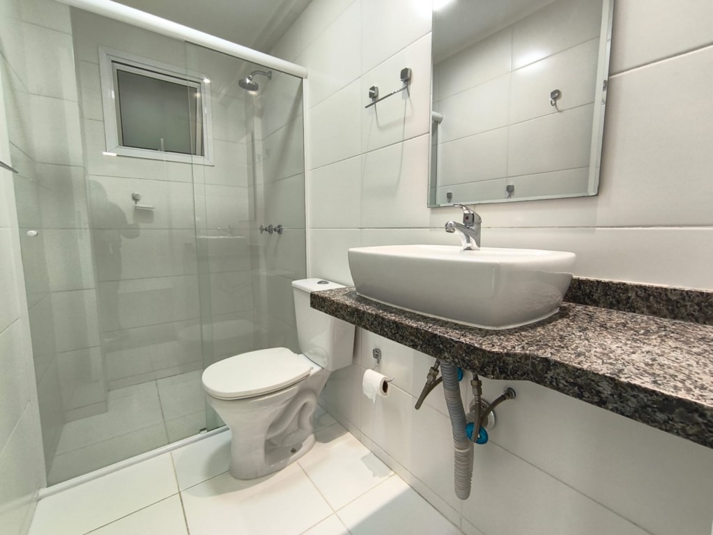 * Banheiro social com box em vidro, tampo de pia em granito e espelho.