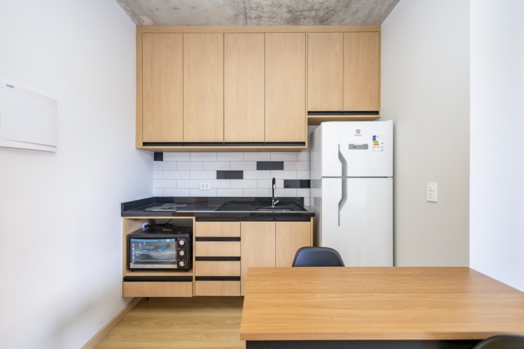 * Cozinha equipada: geladeira, fogão e forno elétrico.