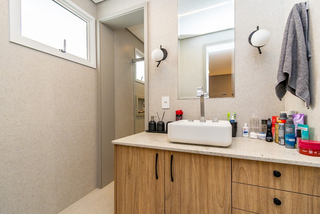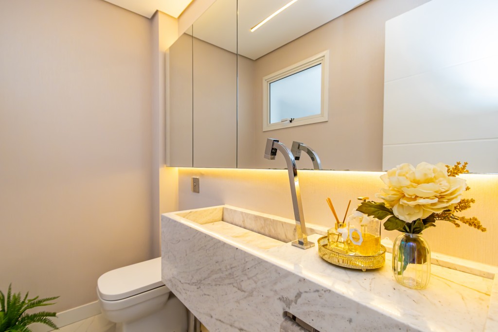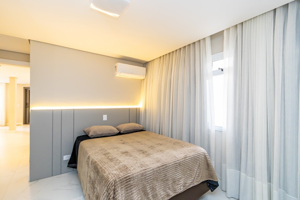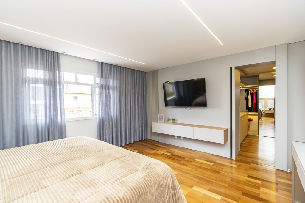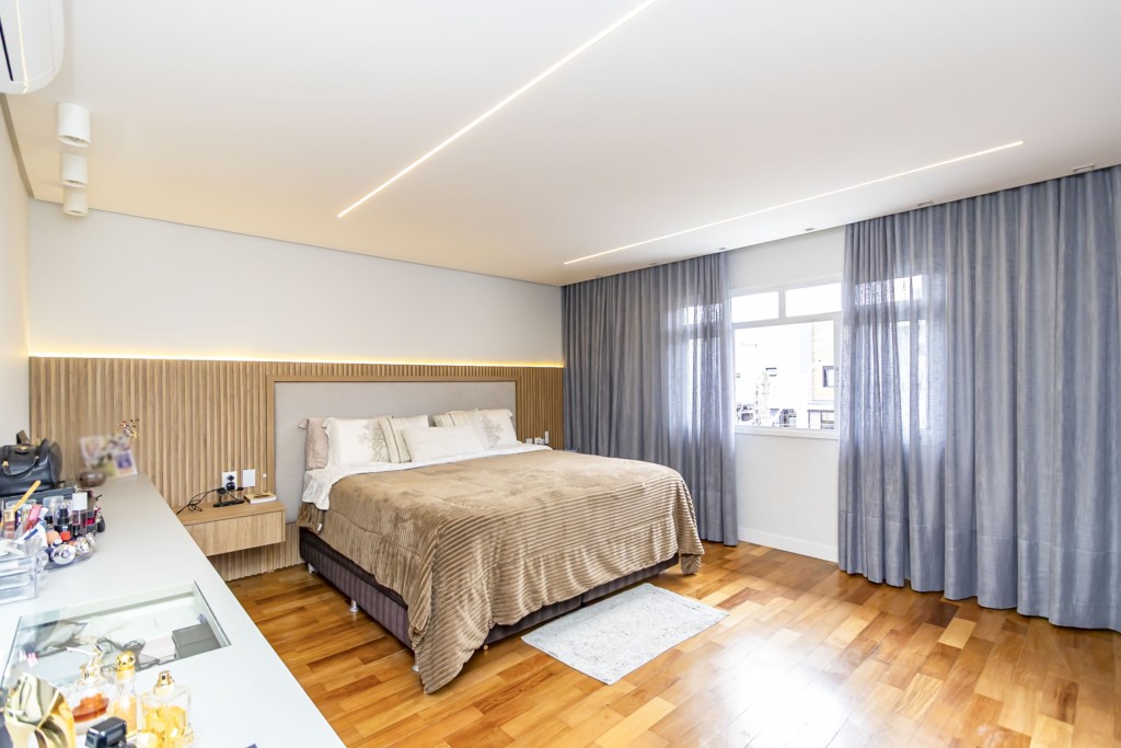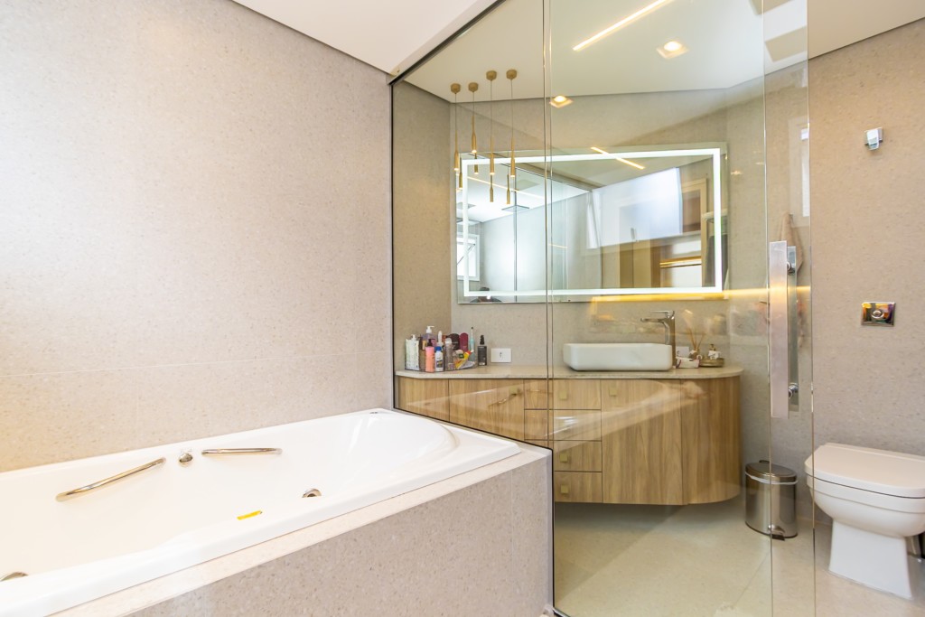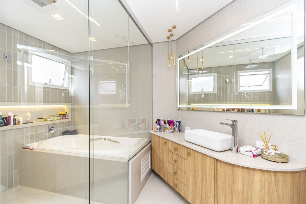 * Suíte máster com closet, penteadeira camarim com espelho de LED e banheiro com cuba dupla e hidromassagem