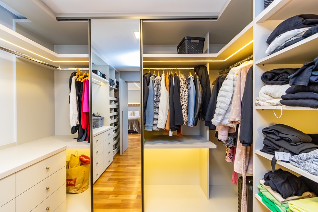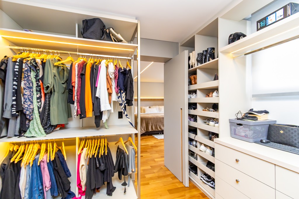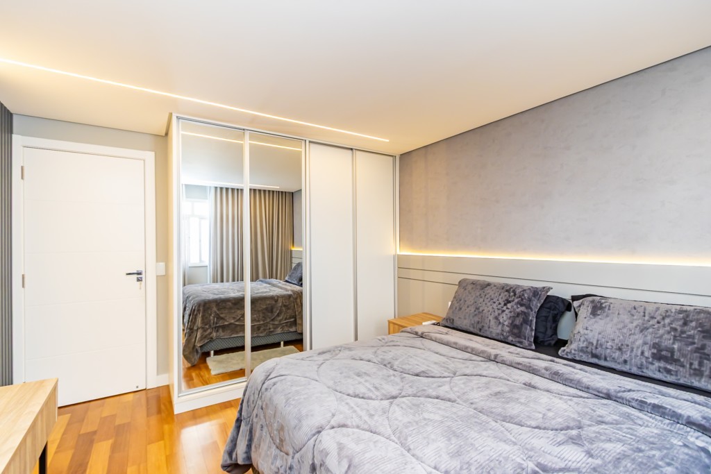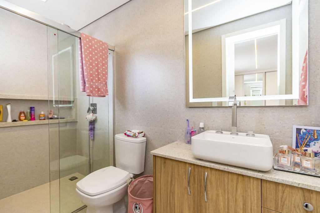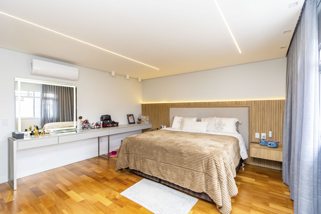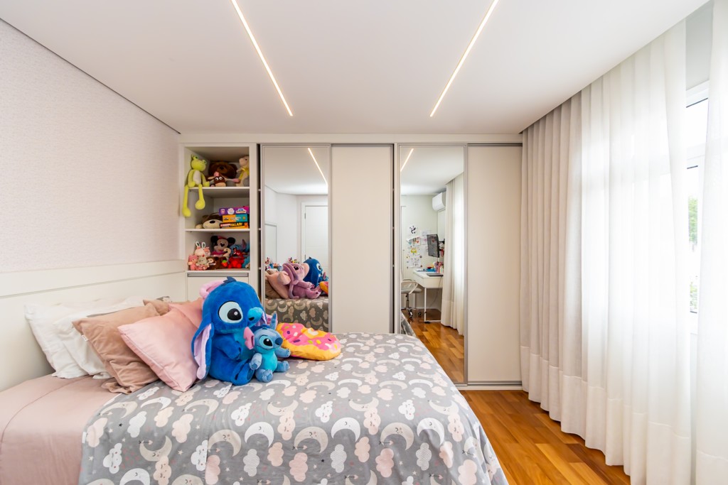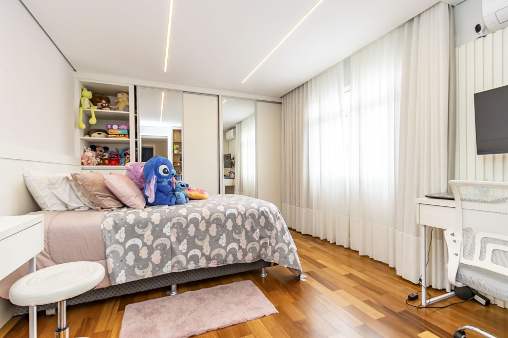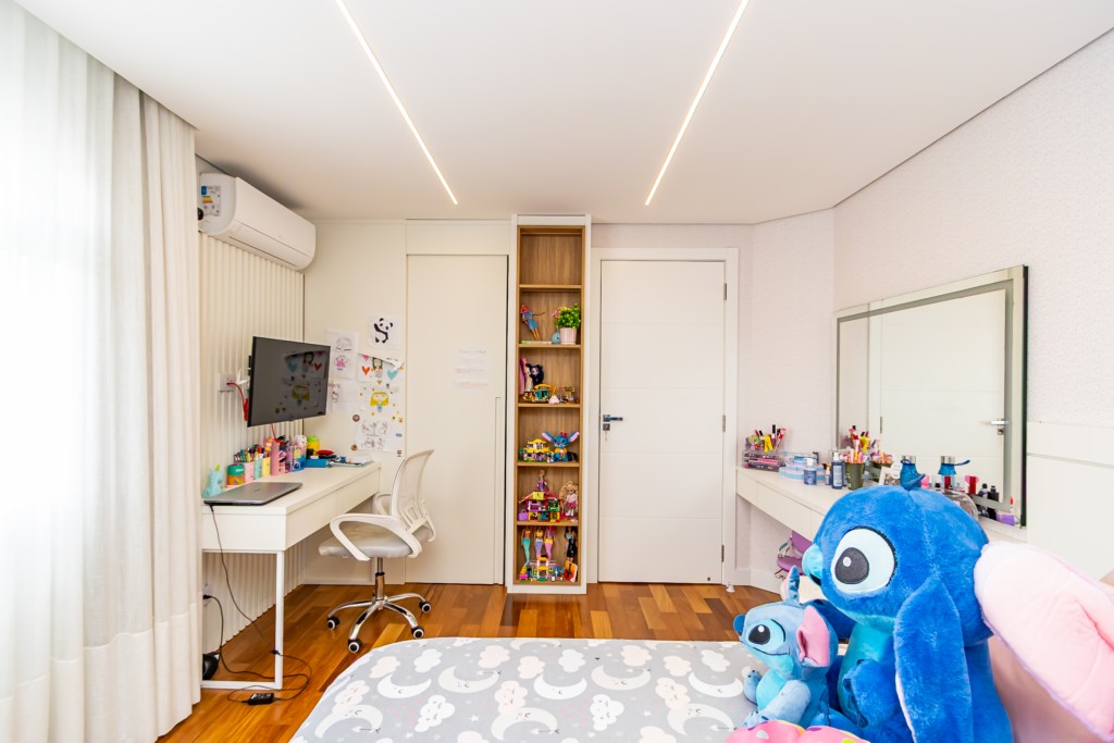 * Suíte 1 com armários, escrivaninha, penteadeira camarim com espelho de LED e banheiro privativo