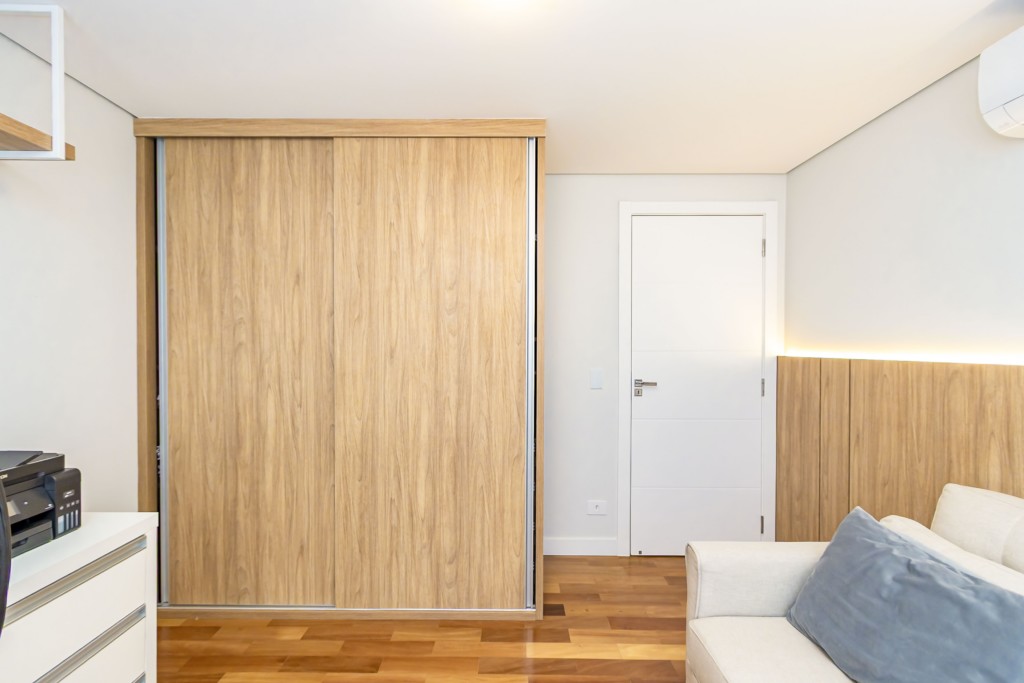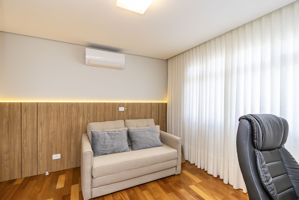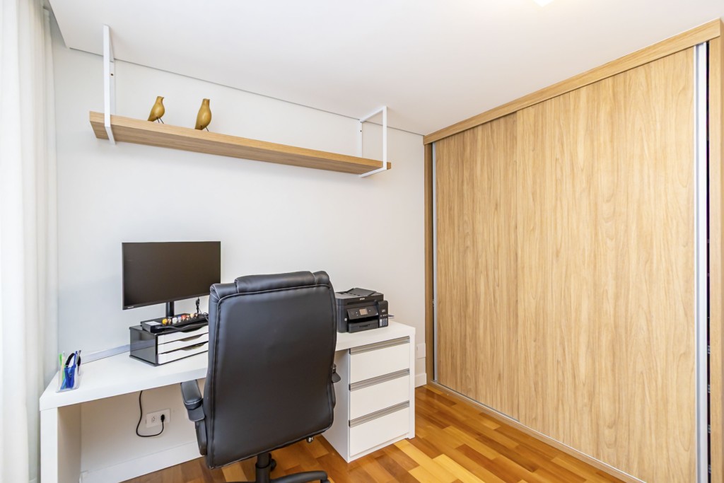 * Escritório mobiliado, podendo ser utilizado como quarto adicional, equipado com sofá-cama de casal e guarda-roupa sob medida