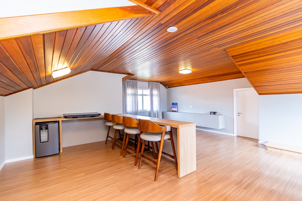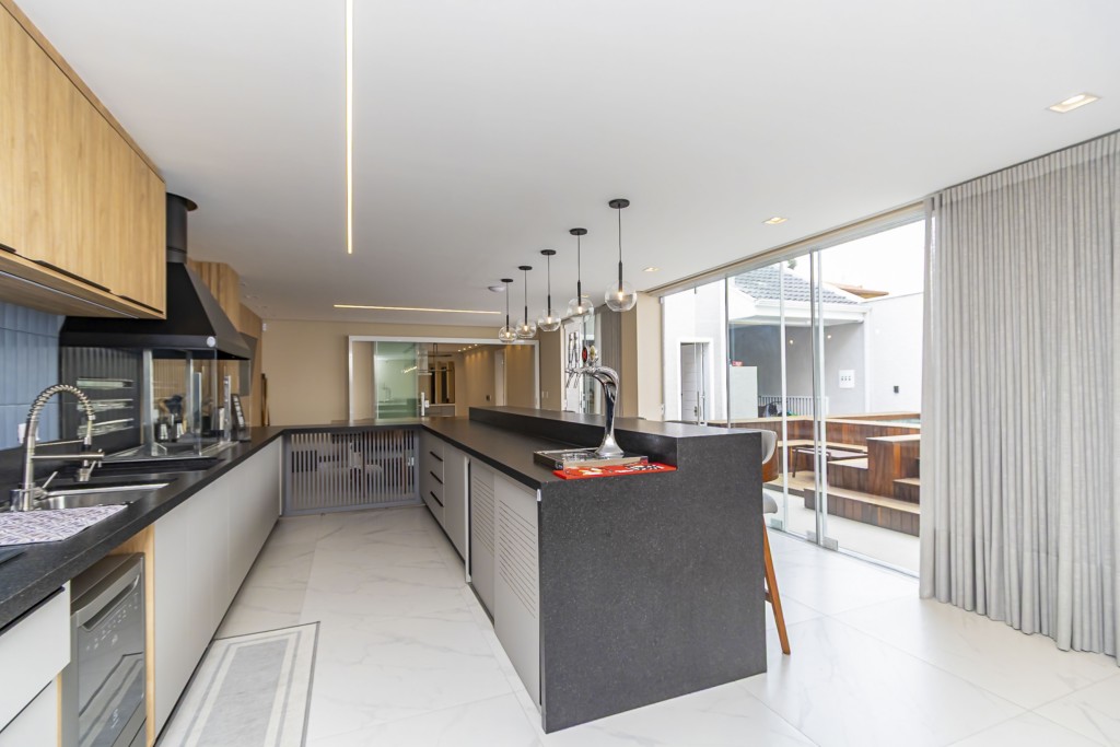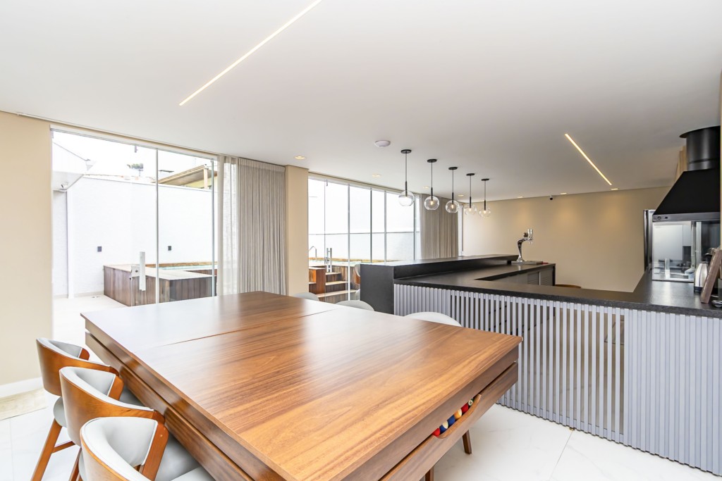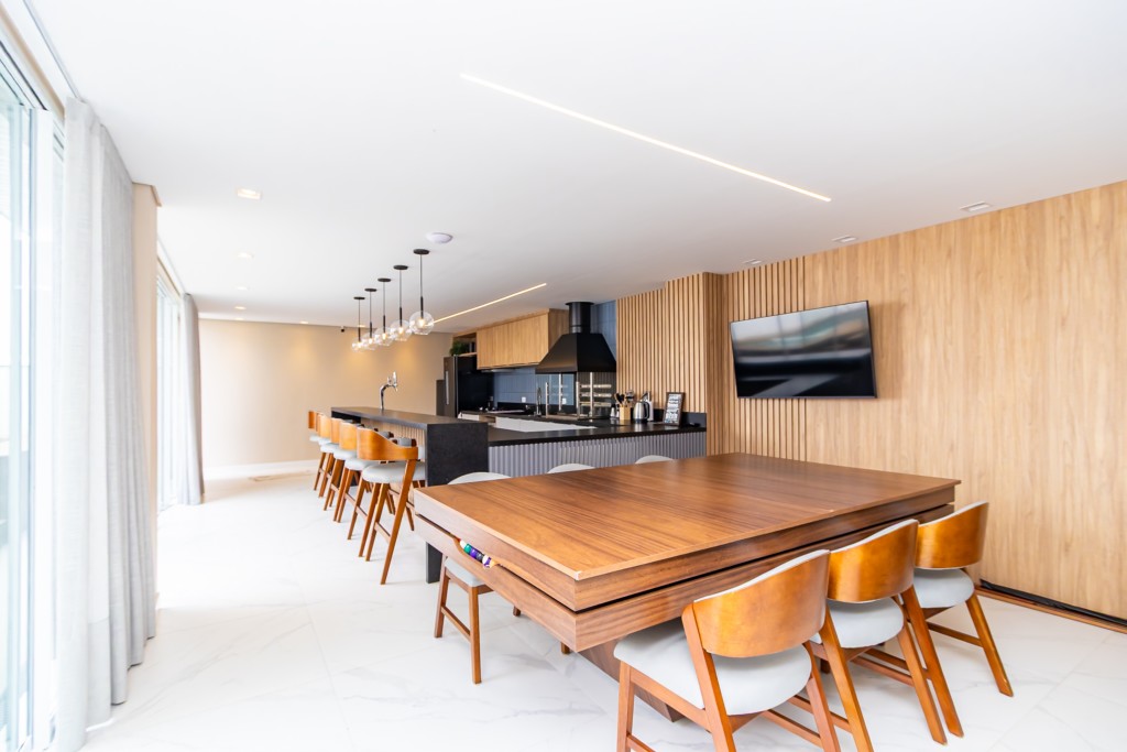 * Espaço gourmet completo, com armários planejados, cooktop, coifa, cervejeira, freezer, chopeira com motor, lava-louça, ampla bancada em granito com banquetas e mesa de jantar-bilhar com 6 cadeiras.