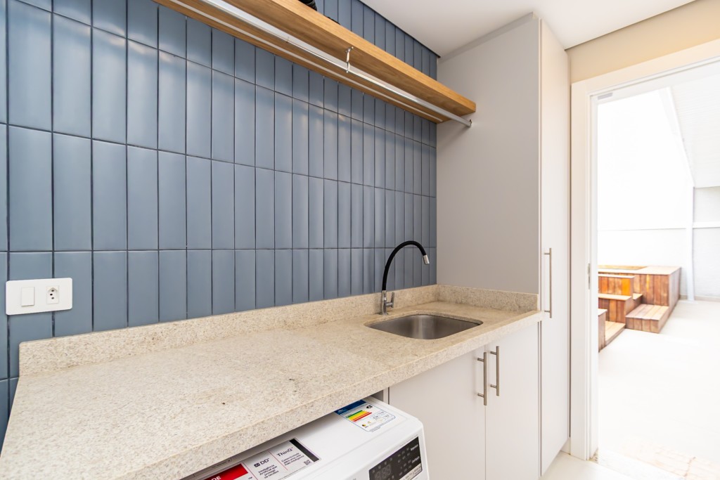 * Lavanderia mobiliada com armários e máquina lava e seca