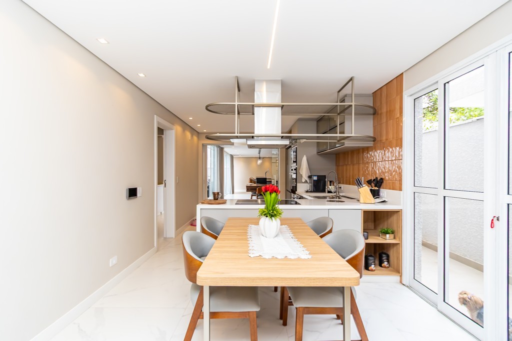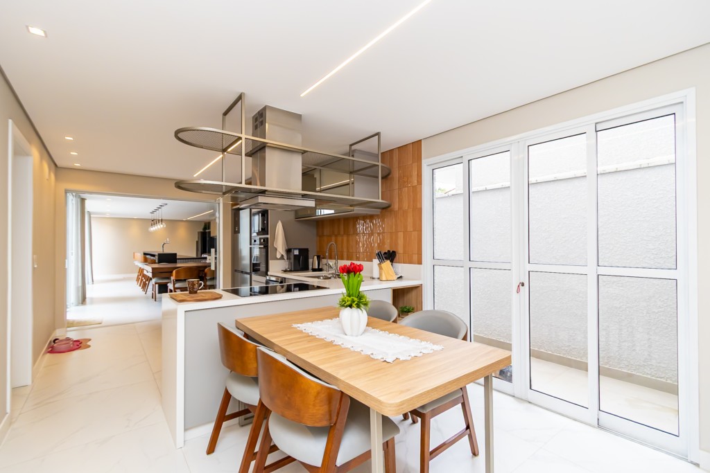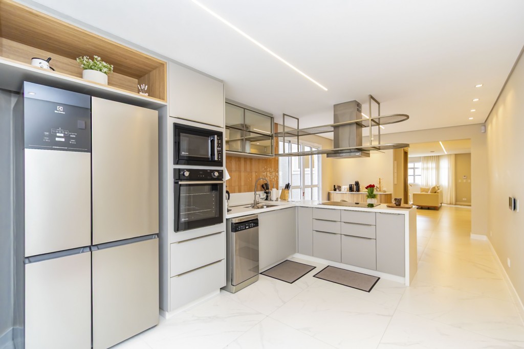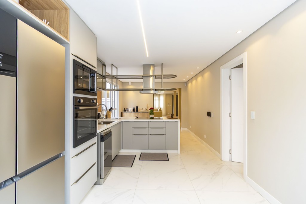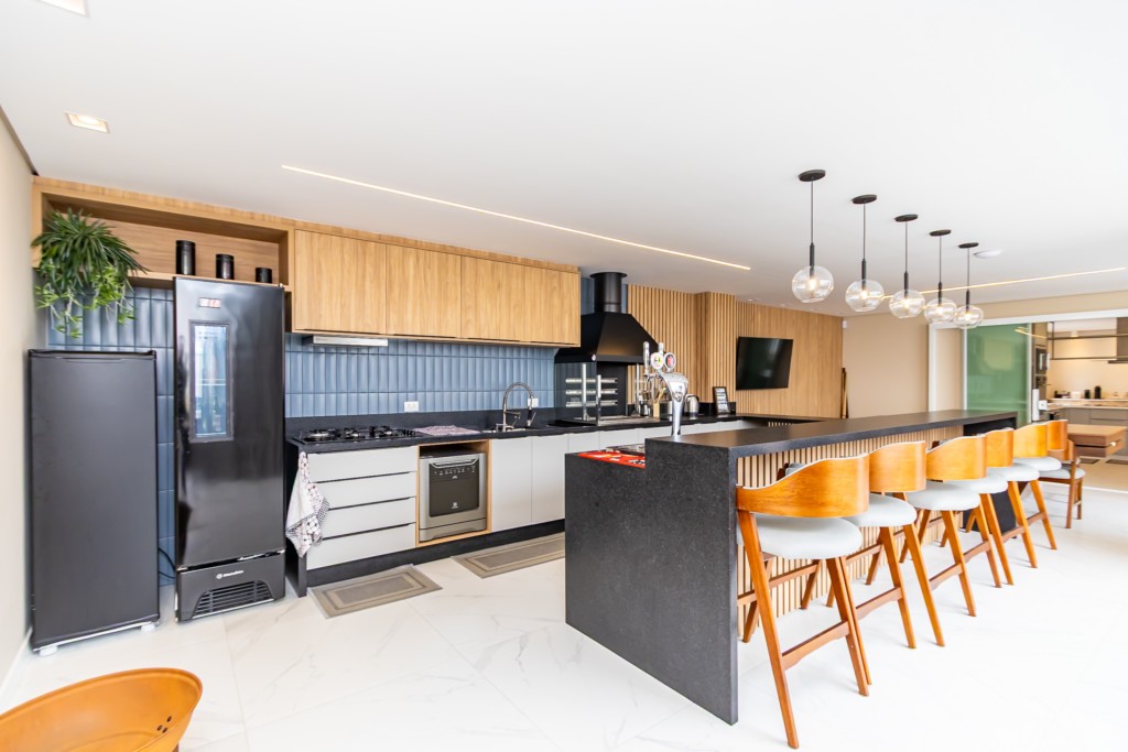 * Cozinha planejada equipada com: geladeira de 4 portas, fogão de indução, forno, coifa, micro-ondas, lava-louça e mesa com 4 cadeiras