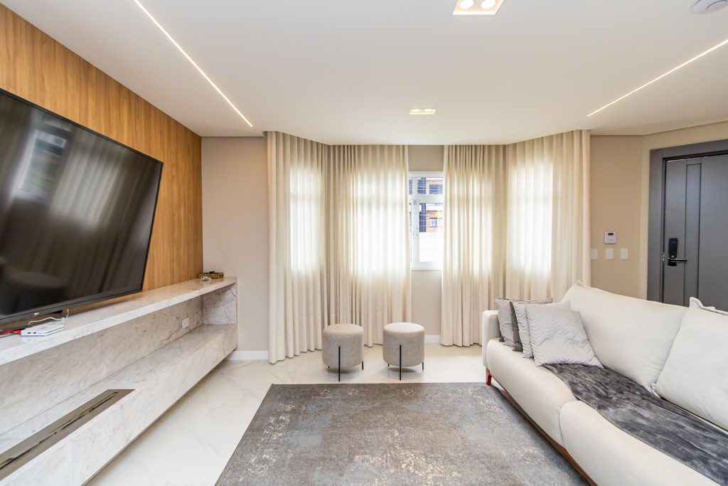 * Sala de estar com painel, sofá, cortina, luminária e lareira