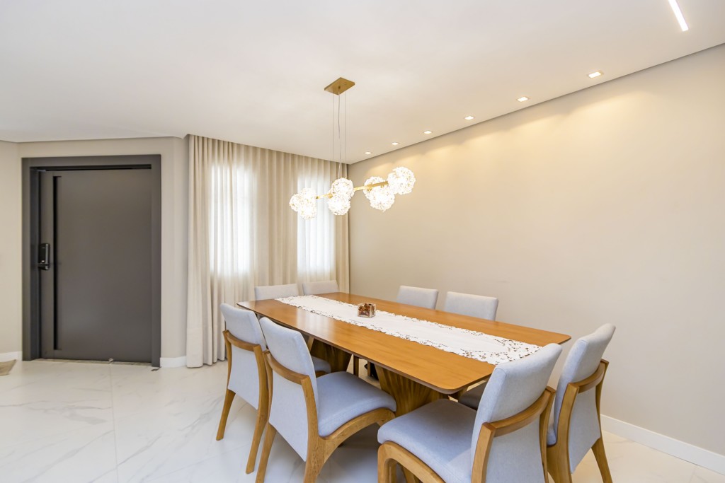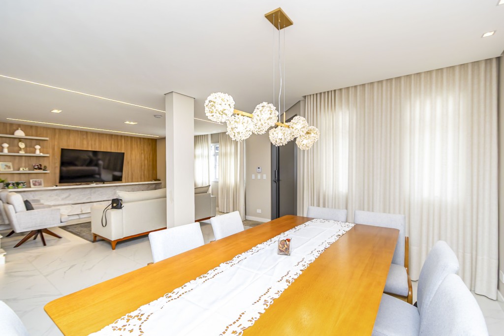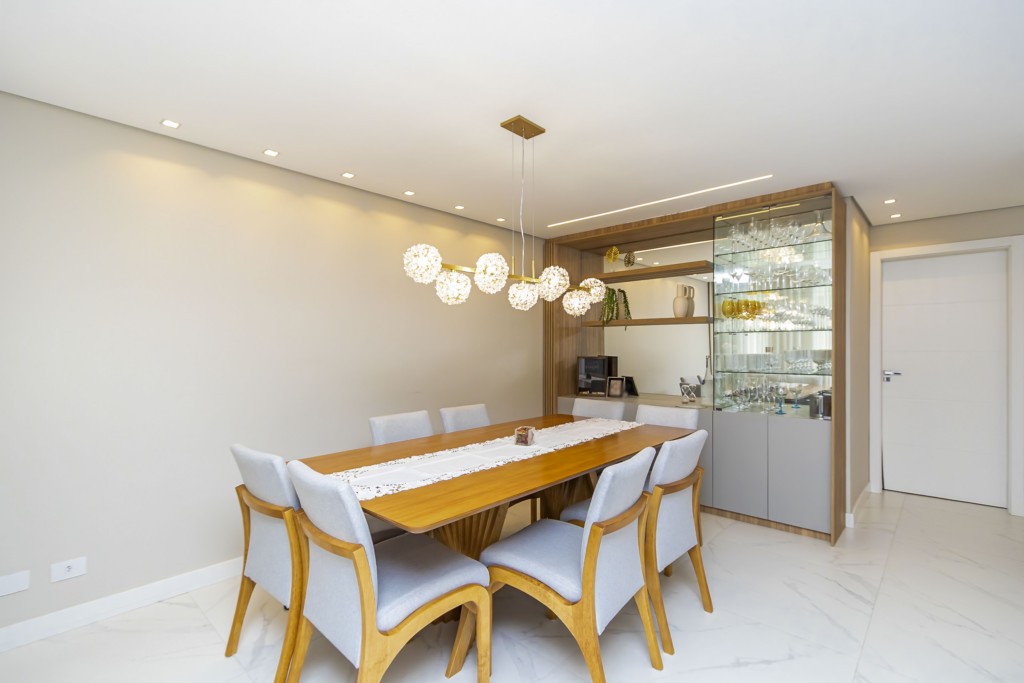 * Sala de jantar com mesa para 8 lugares, lustre e cristaleira