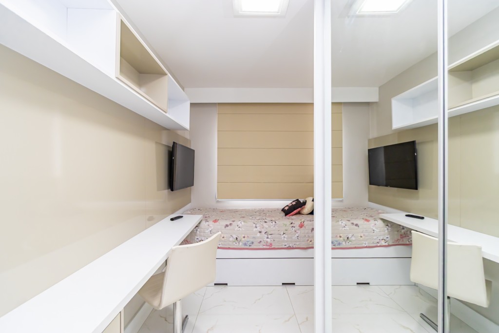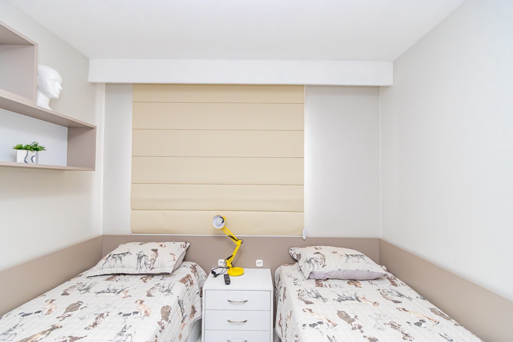* 3 quartos sendo 01 suíte, todos com móveis planejados e camas.