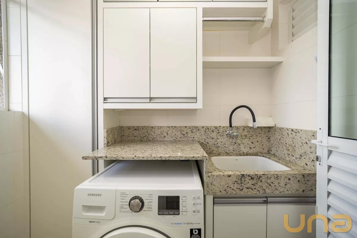 Cozinha estilo americano, com parte integrada à sala, e área de serviço muito funcional.