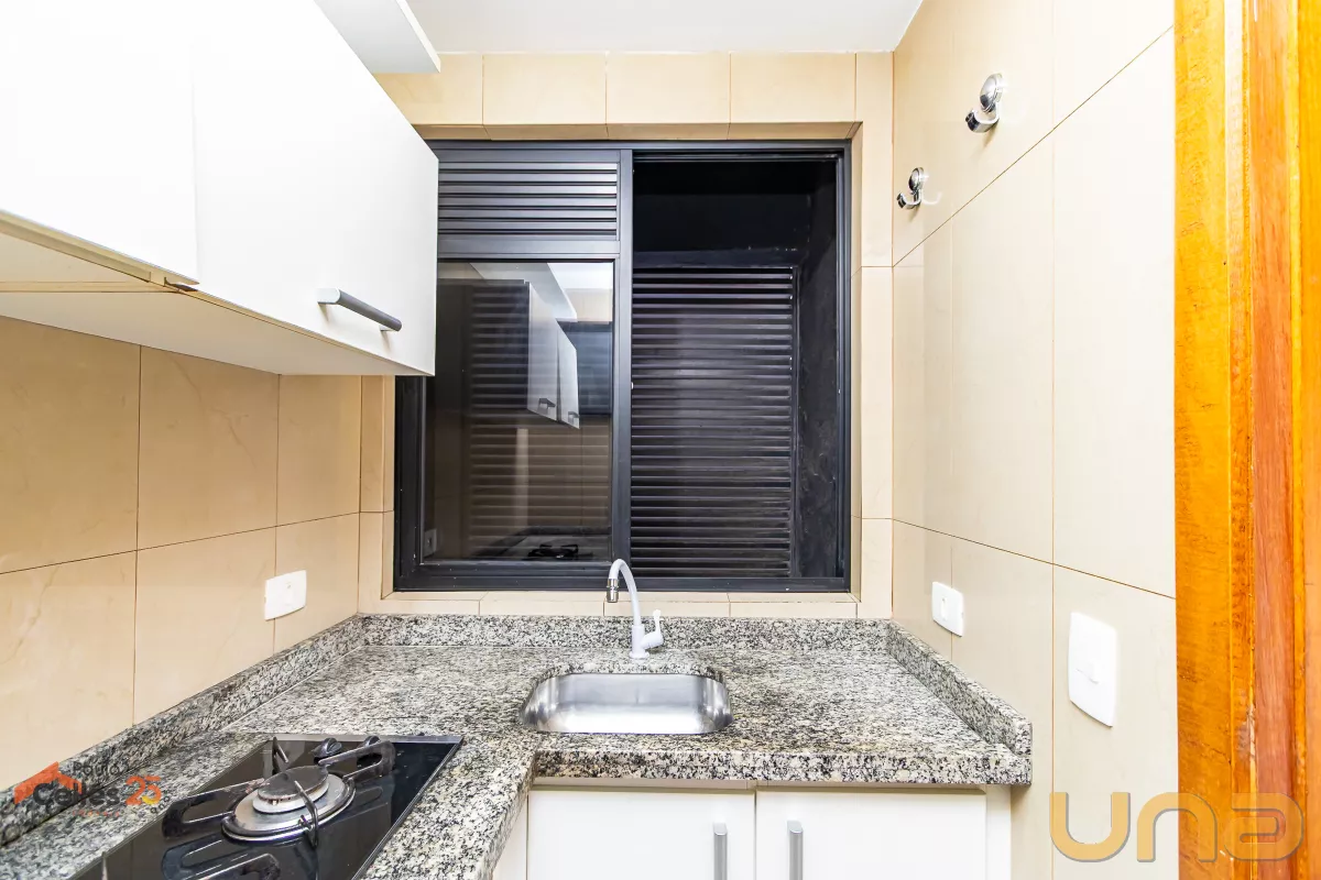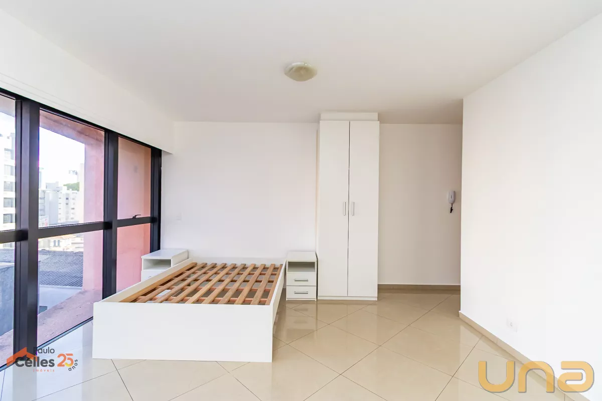 Com ambiente integrado, o estúdio conta com armários embutidos, cama, piso em porcelanato e janelas amplas com vista panorâmica para a cidade. A cozinha é equipada com armários e o banheiro possui box em vidro temperado.