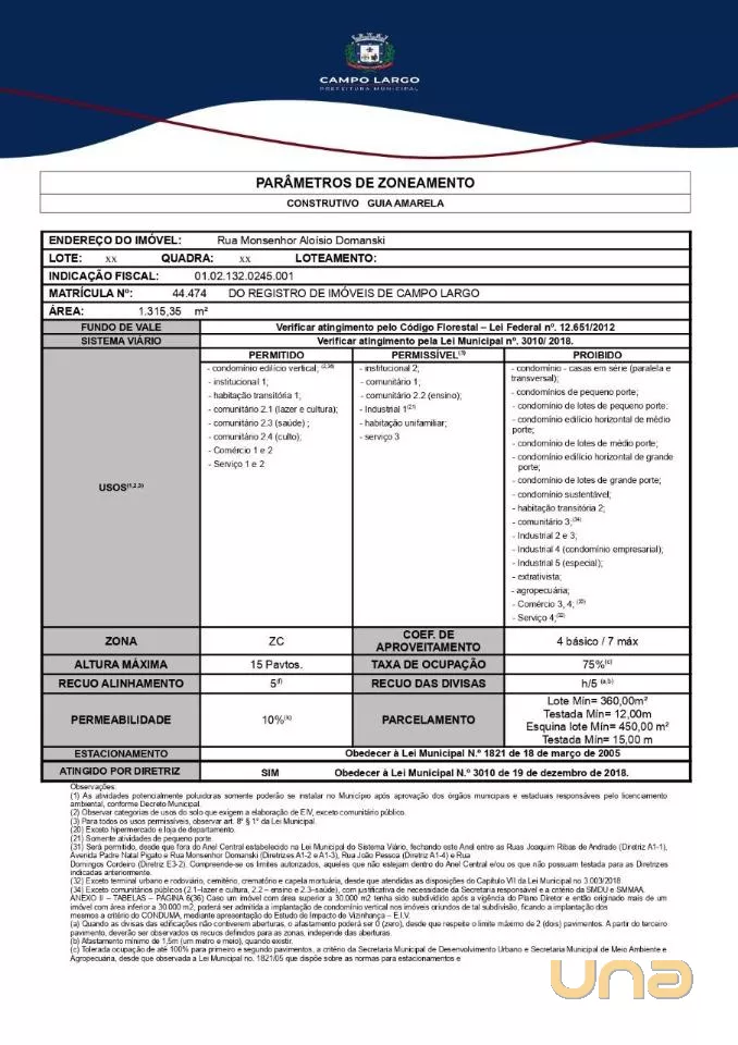 Terreno central com 1315m², com frente de 90,00m para Rua Quintino Bocaiúva X Rua Monsenhor Aluísio Domanski, próximo a Praça do Skate, local de hospitais e clínicas.