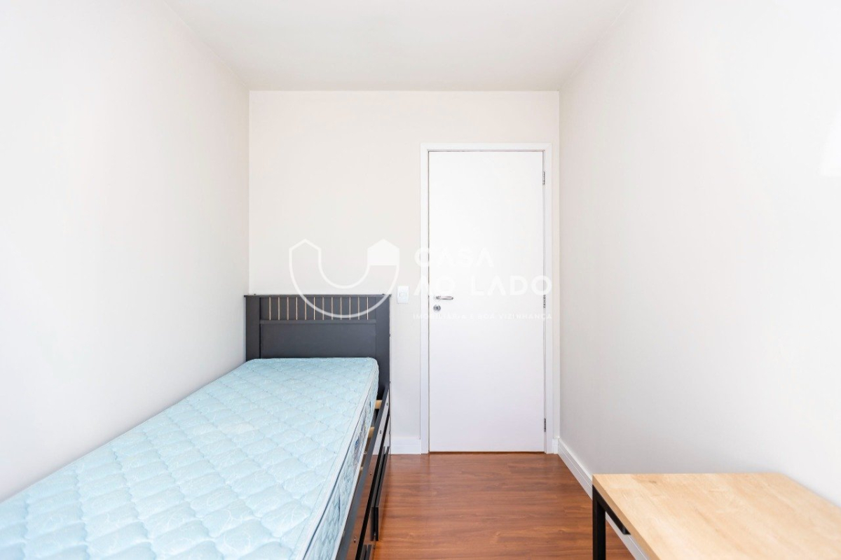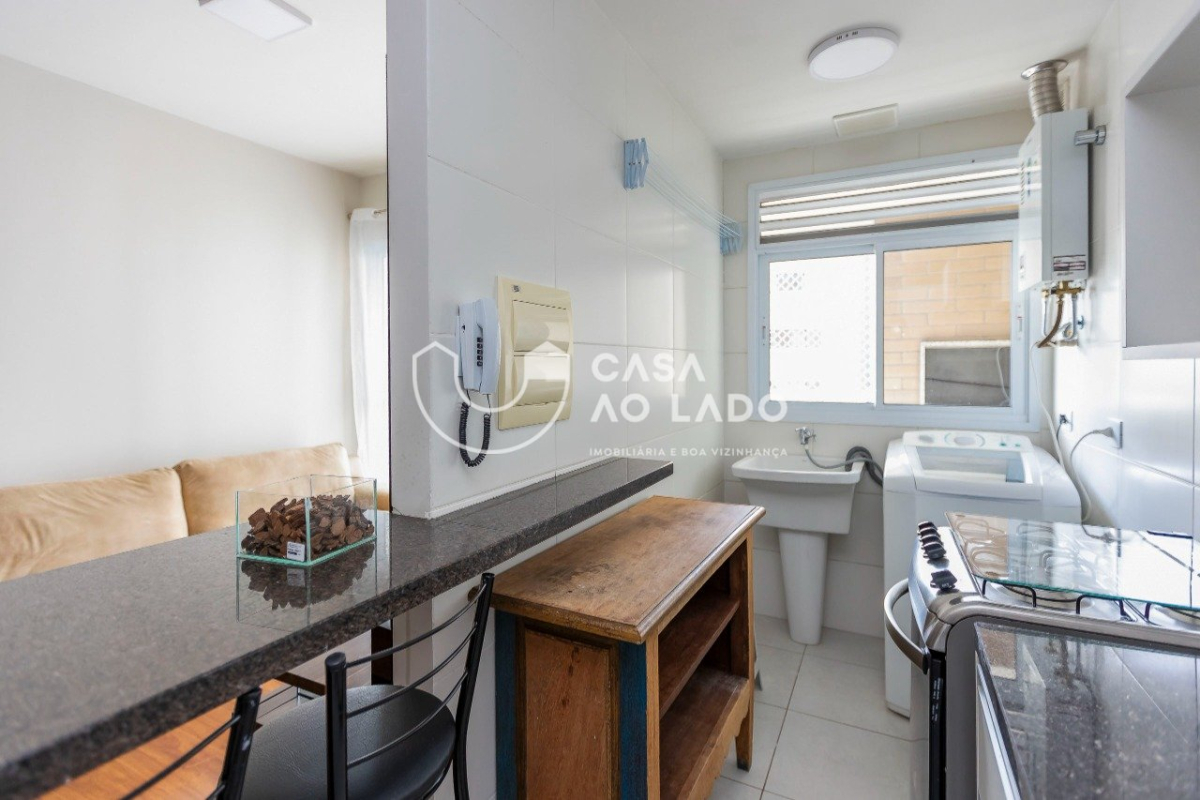 O apartamento conta com sala para dois ambientes com mesa de jantar, aparador, sofá e ainda uma sacada com churrasqueira à carvão, cozinha equipada com armários, fogão, e geladeira dando acesso á lavanderia, e banheiro social.