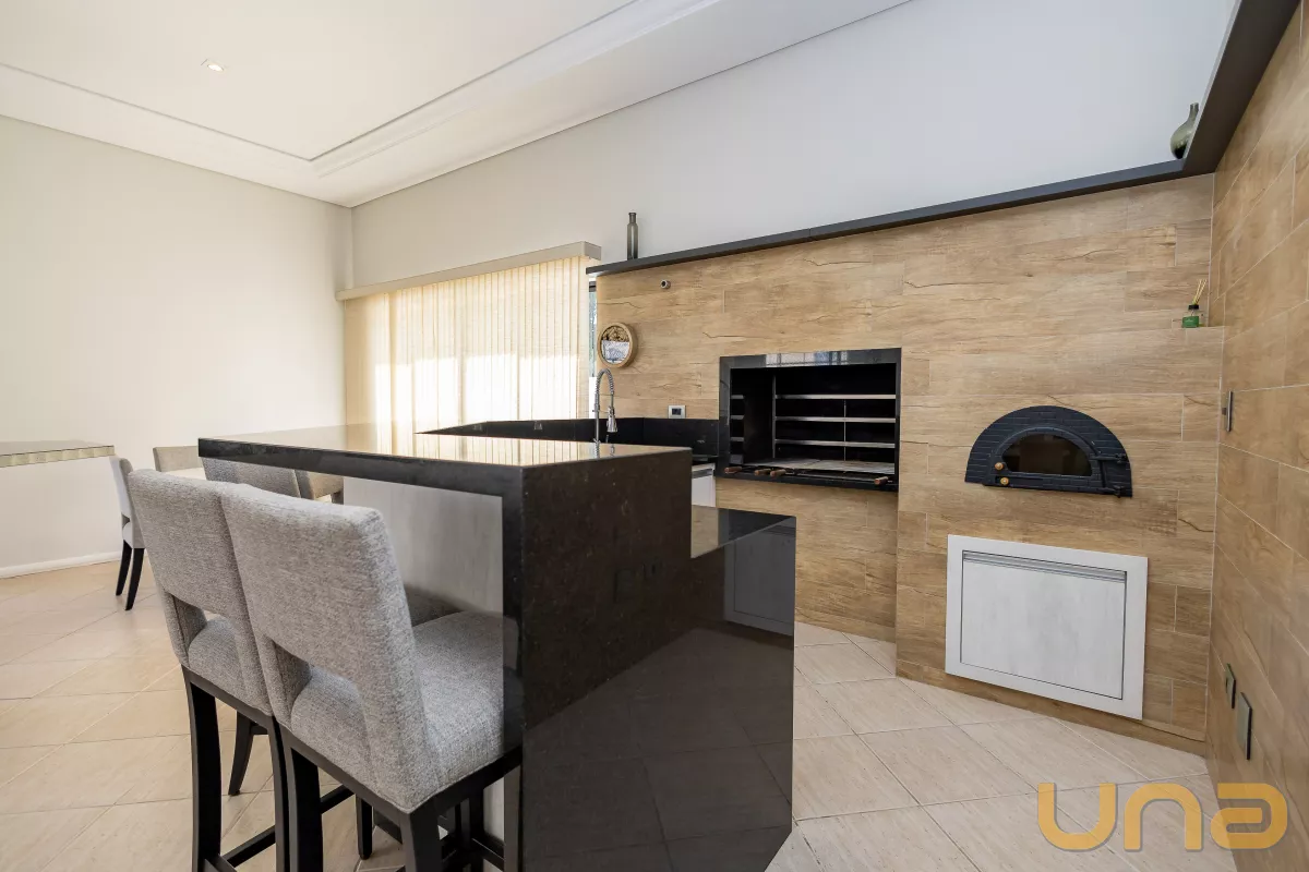 Ampla sala para 02 ambientes (estar e jantar) com mesa de jantar, lareira, sacada com churrasqueira a carvão, lavabo, banheiro social, móveis sob medida e cozinha com fogão e exaustor dando acesso à lavanderia.