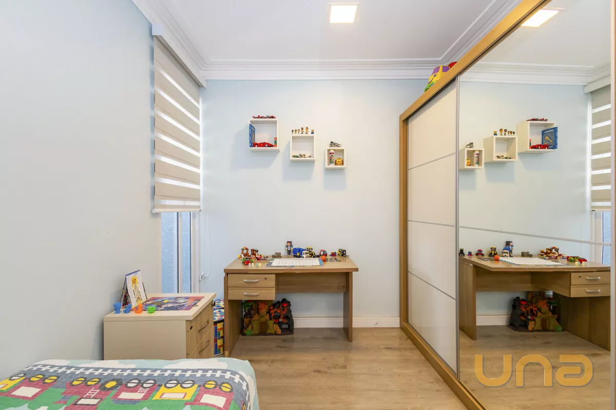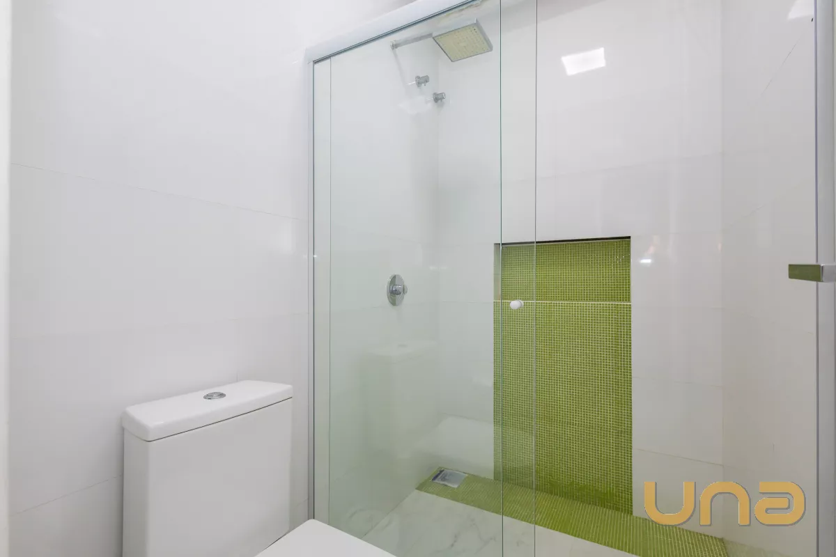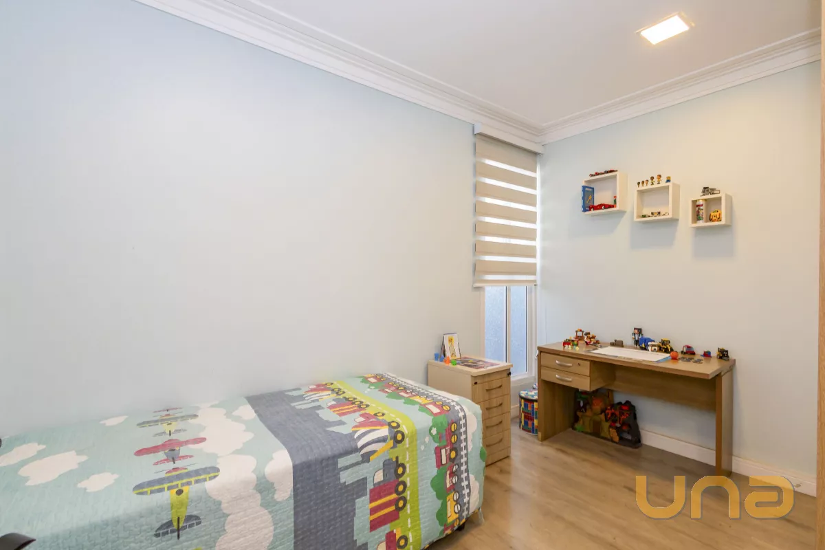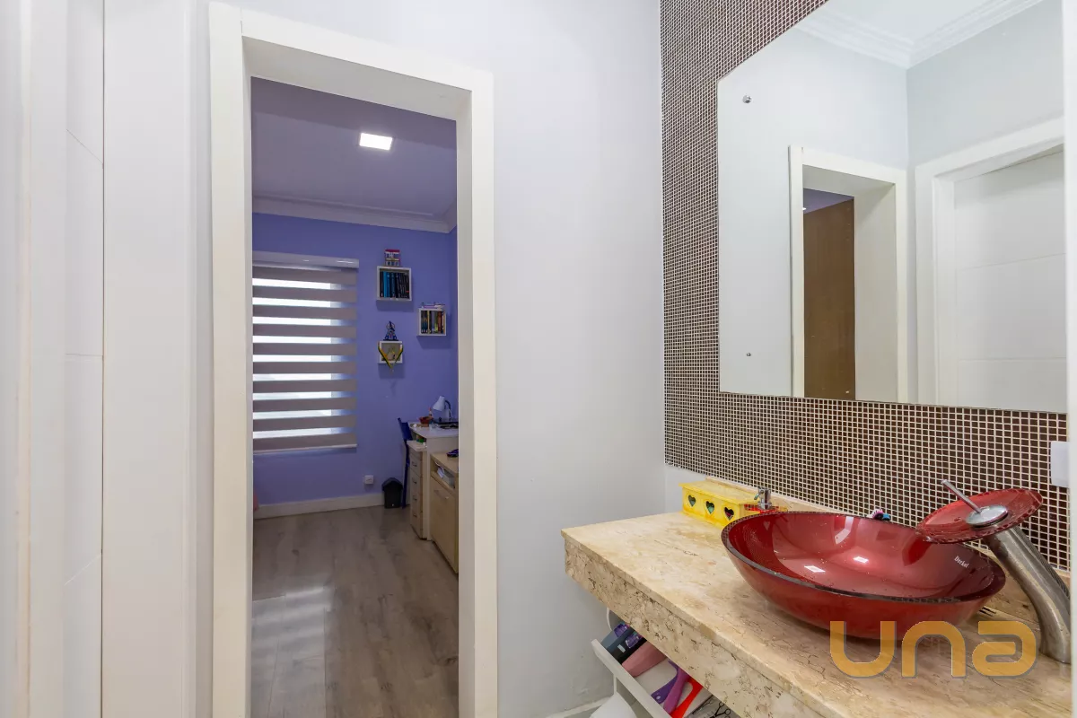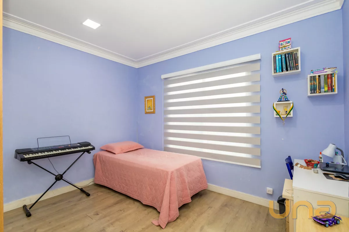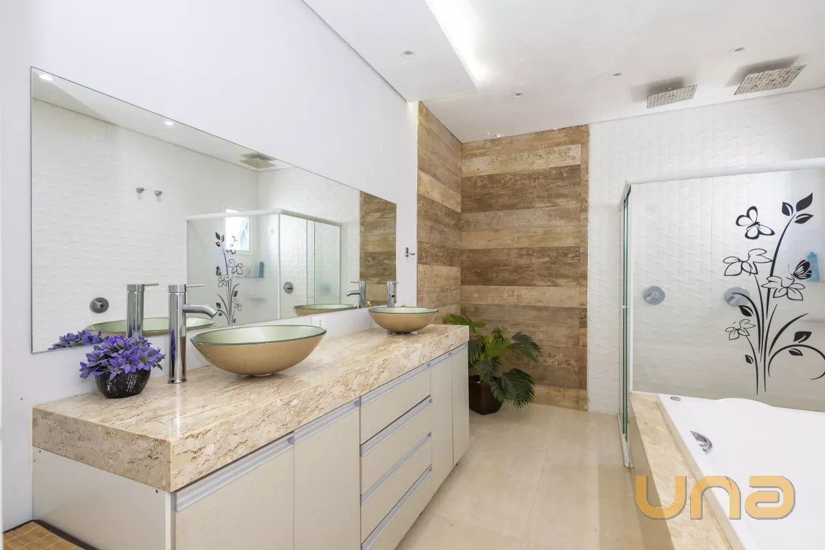Subindo pela escada revestida em mármore travertino, chegamos ao segundo andar, que oferece uma ampla suíte com sacada, armários planejado, espaço para closet, ar condicionado e um amplo banheiro com pia dupla e banheira. Ao lado, outro amplo quarto com ar condicionado que está sendo utilizado como escritório e área externa com churrasqueira, mais armários e área de lavanderia.