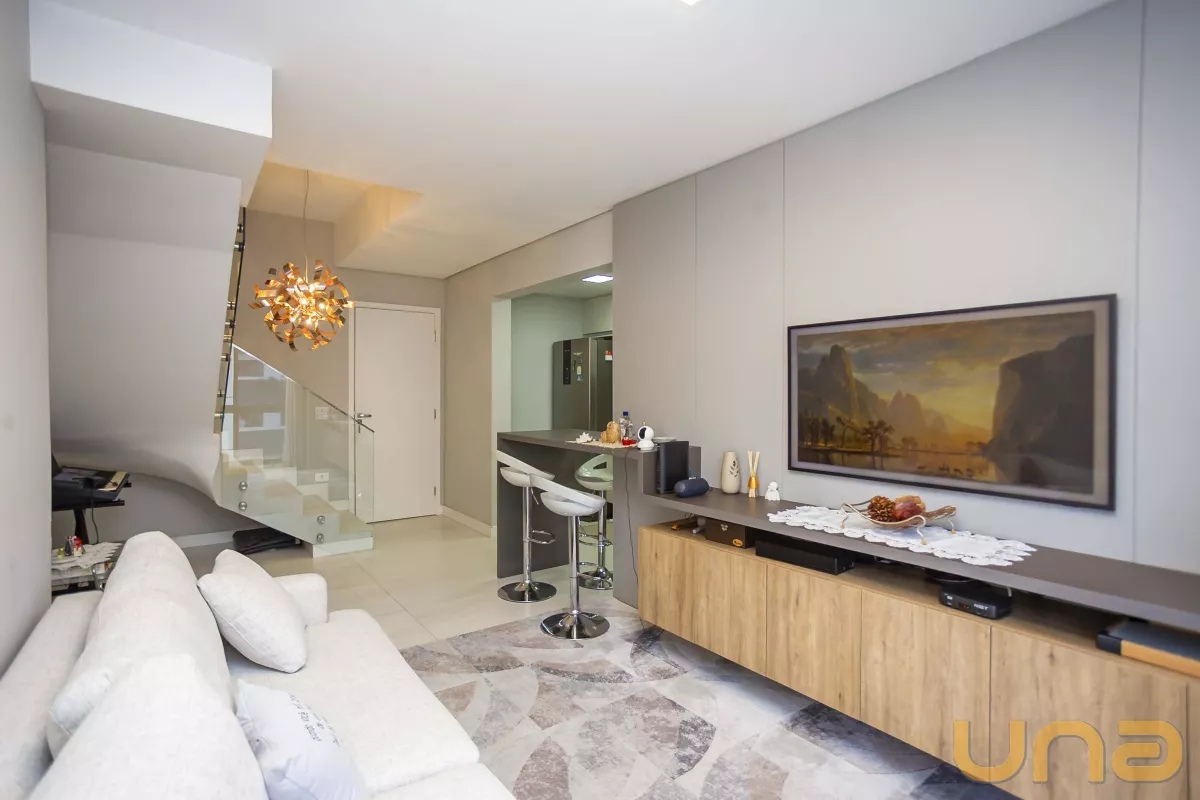 A sala de estar é ampla e elegante, com marcenaria planejada, piso em porcelanato e iluminação embutida em LED.