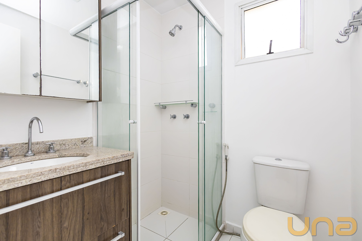 Piso laminado, espelho na sala de jantar trazendo amplitude para o ambiente, box de vidro temperado e armário no banheiro social.