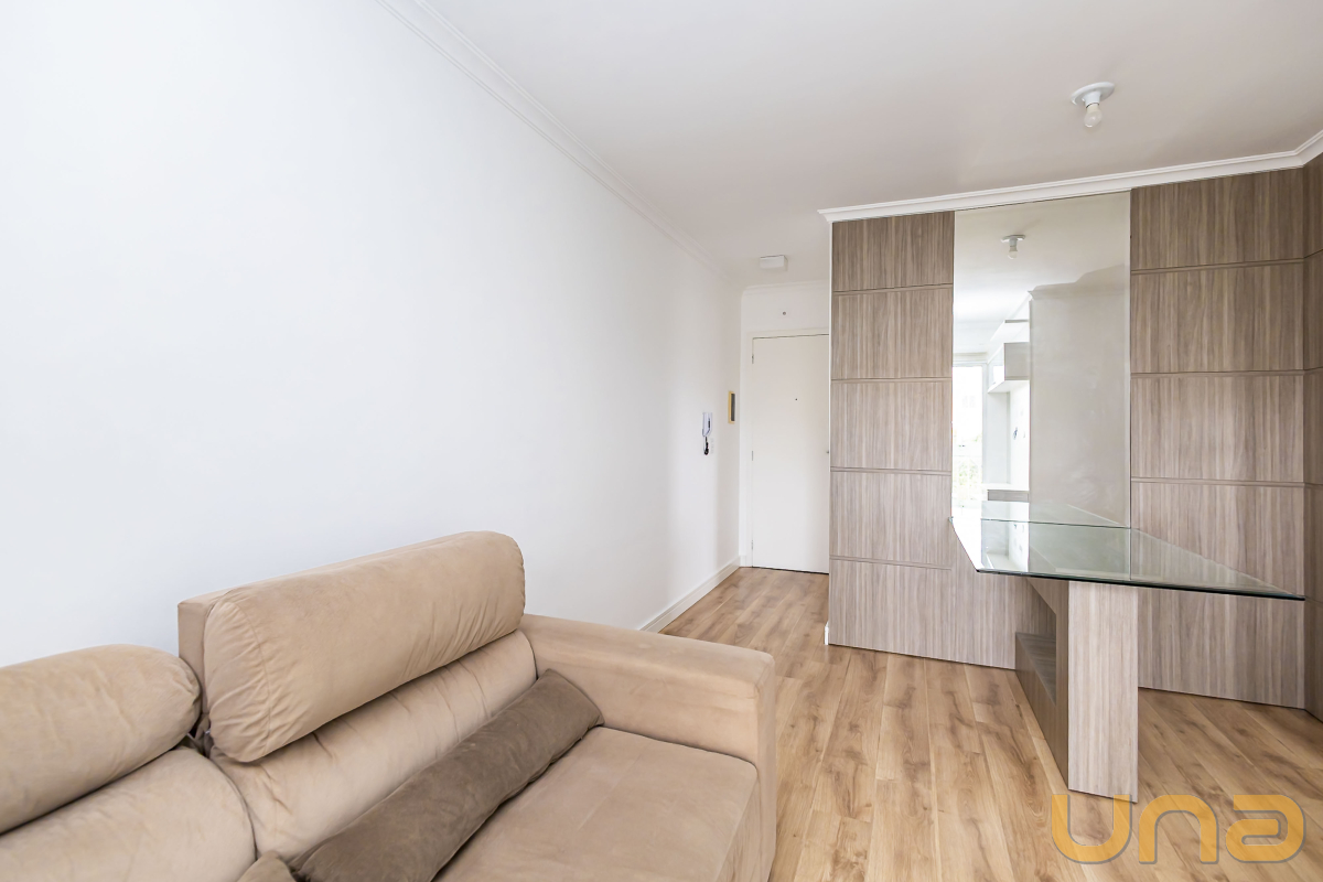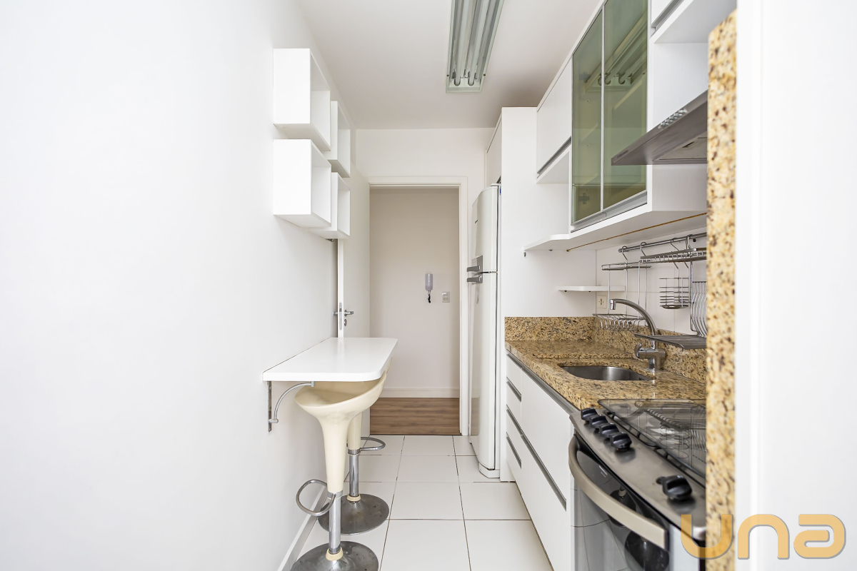 Sala para dois ambientes (estar e jantar), sala conta com sofá e um painel com raque para TV dando acesso á sacada, ja a sala de jantar conta com uma mesa de centro, cozinha equipada com armários, fogão, geladeira, uma mesa com banqueta dando acesso á lavanderia, e banheiro social.