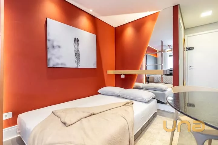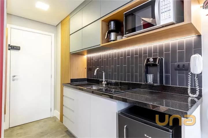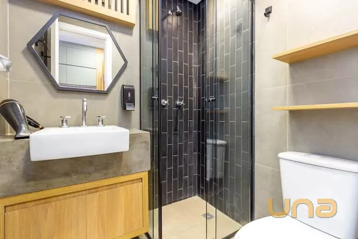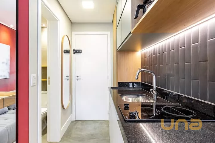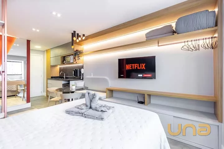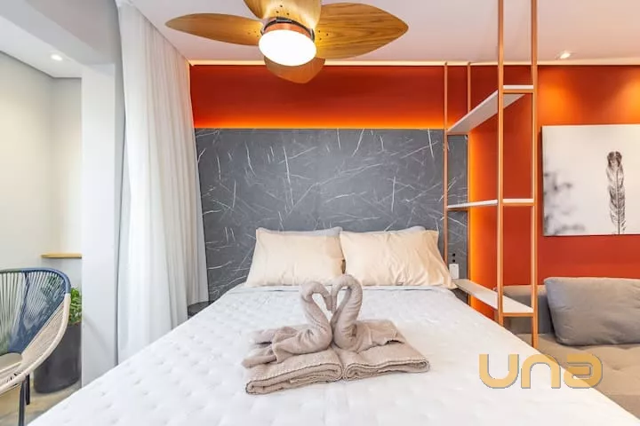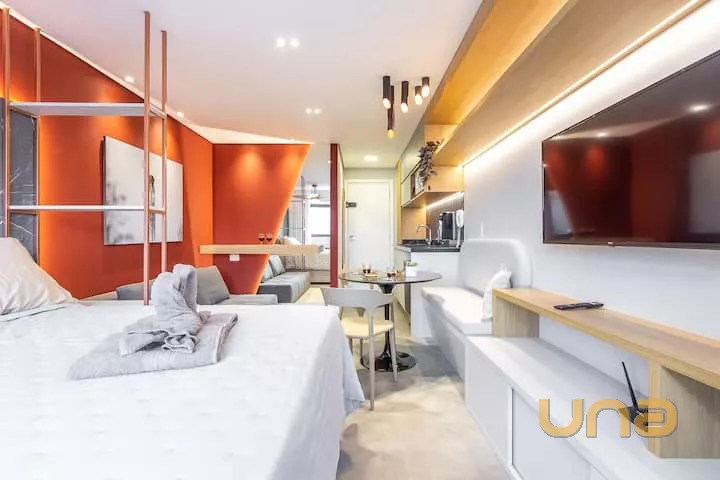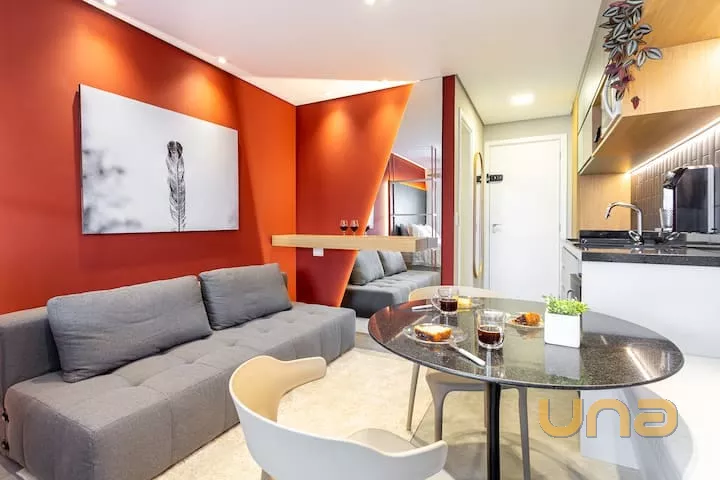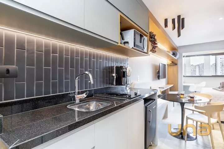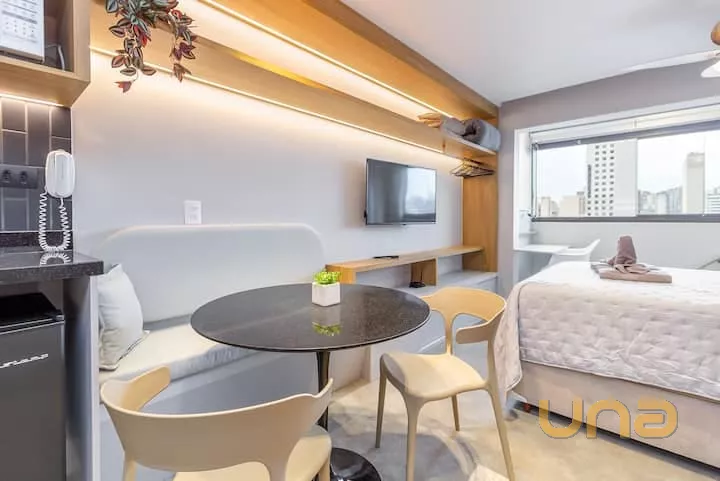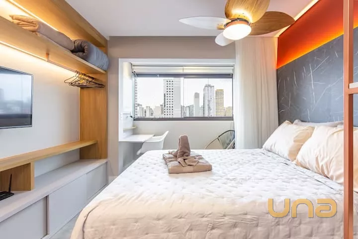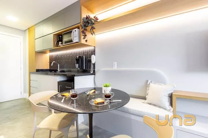 Apartamento totalmente mobiliado, com acabamento em piso de cimento queimado e ambientes bem distribuídos e equipados para oferecer praticidade e conforto. O imóvel conta com armários embutidos, cama, sofá-cama, mesa com cadeiras, ventilador de teto, TV com painel, além de cozinha equipada com frigobar, fogão por indução, micro-ondas, pia e bancada em pedra de granito. O banheiro é completo, com box de vidro, pia com armário, espelho, chuveiro a gás e luminária.