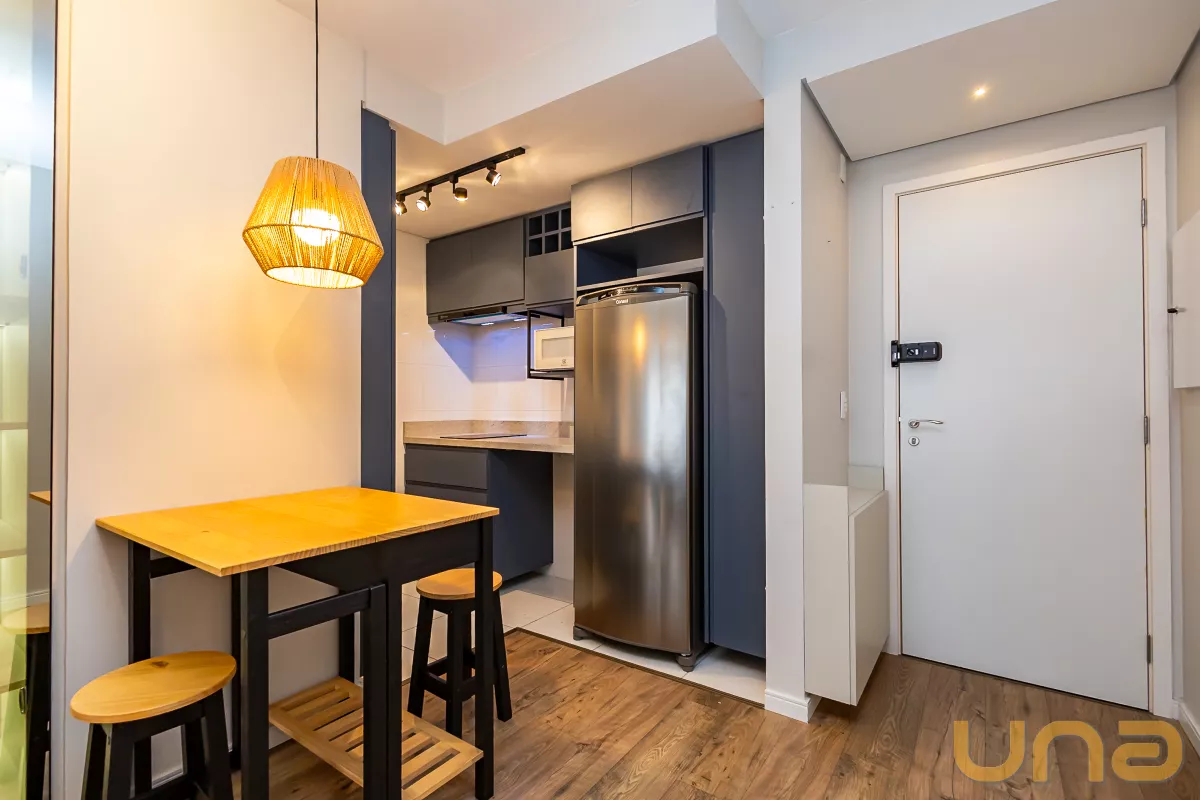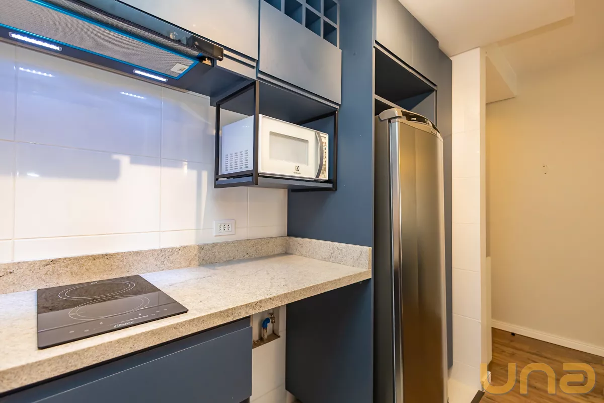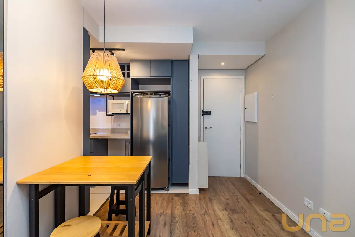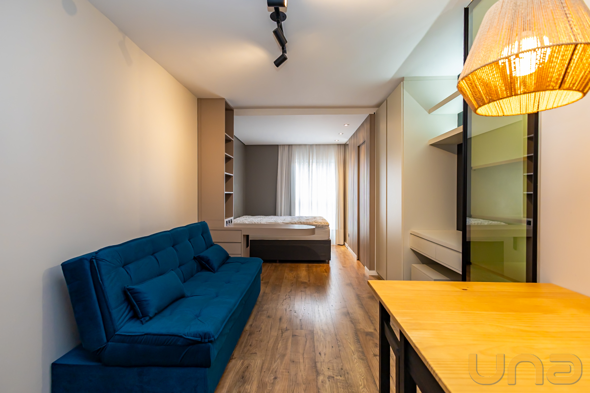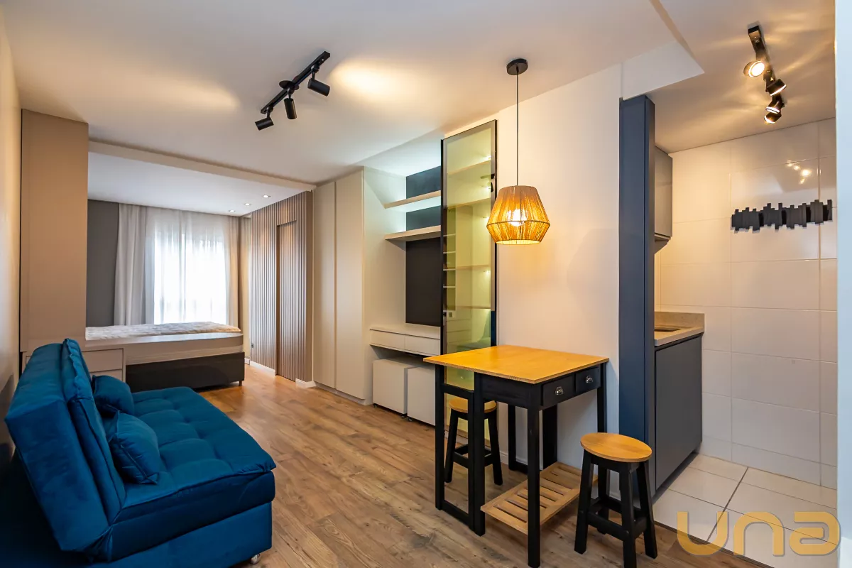 Studio mobiliado, com piso laminado e ambientes bem equipados, ideal para quem busca praticidade e conforto no centro da cidade.