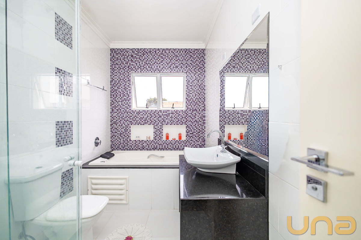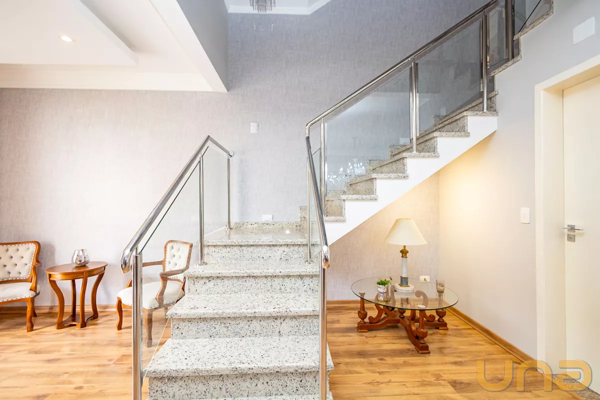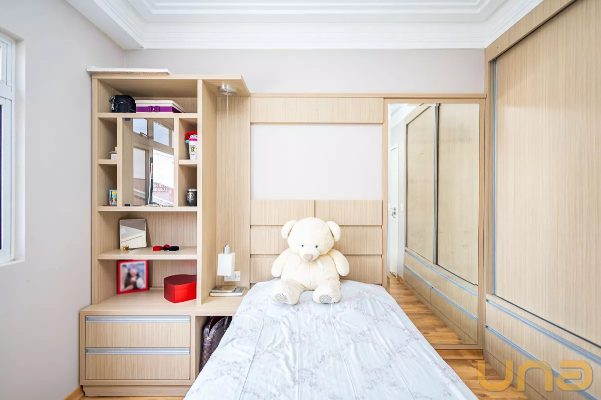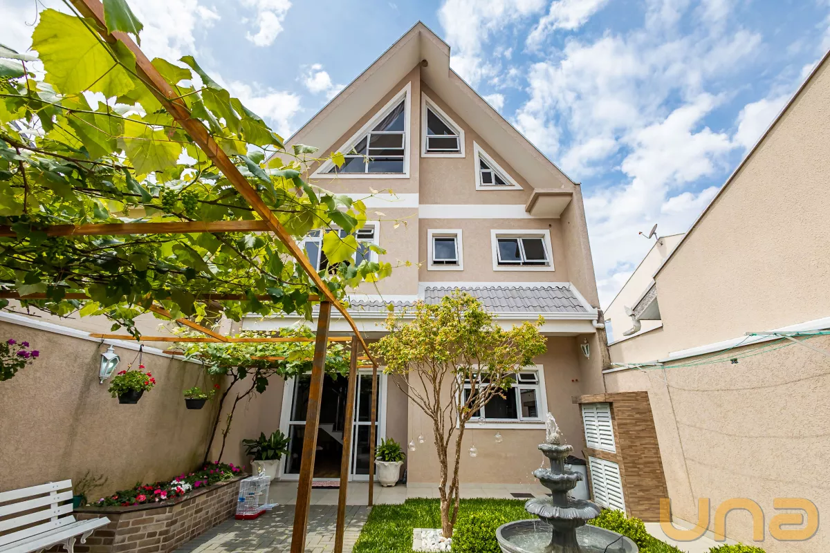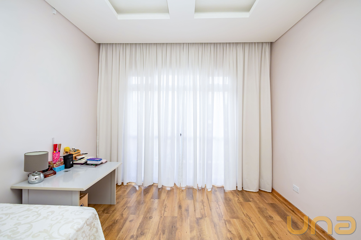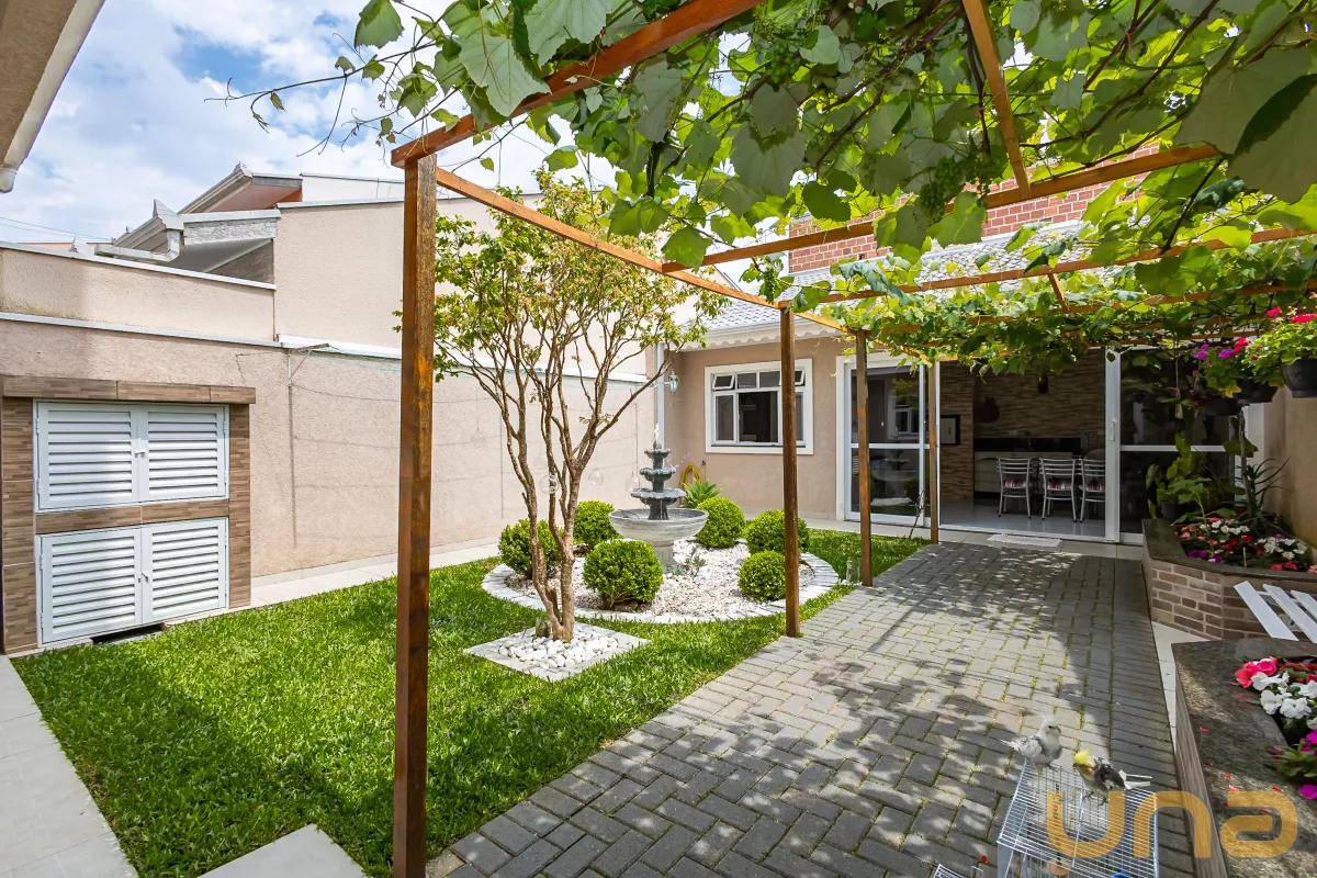 Nos fundos, há um jardim encantador com plantação de uvas, fonte decorativa, árvore e uma edícula com churrasqueira, o espaço ideal para receber amigos e família. A edícula ainda conta com lavabo e lavanderia ampla. A escada com iluminação embutida leva ao segundo andar, onde estão os dormitórios. O primeiro quarto possui sacada com vista para a rua; o segundo conta com armário planejado, cama e mesa de estudos, além da vista para o quintal. A suíte master é um destaque à parte, com sacada, closet com portas espelhadas e banheiro com banheira.