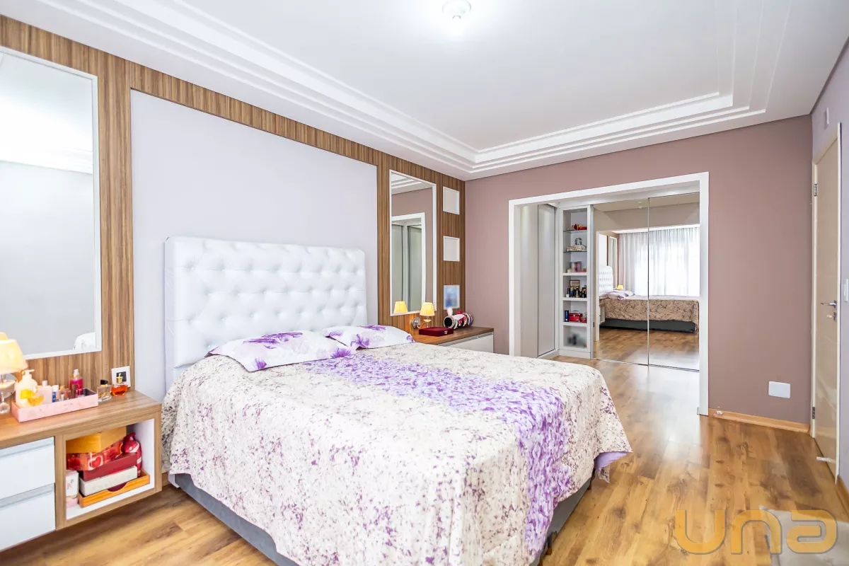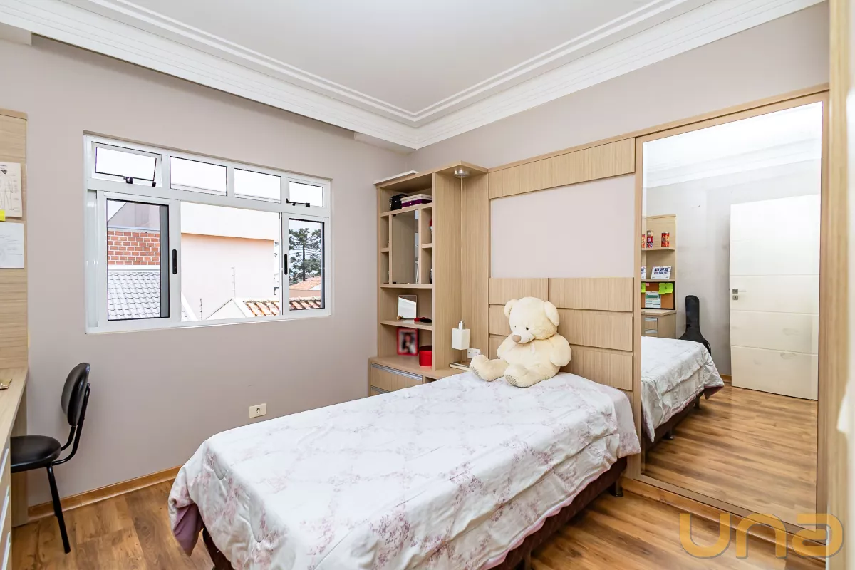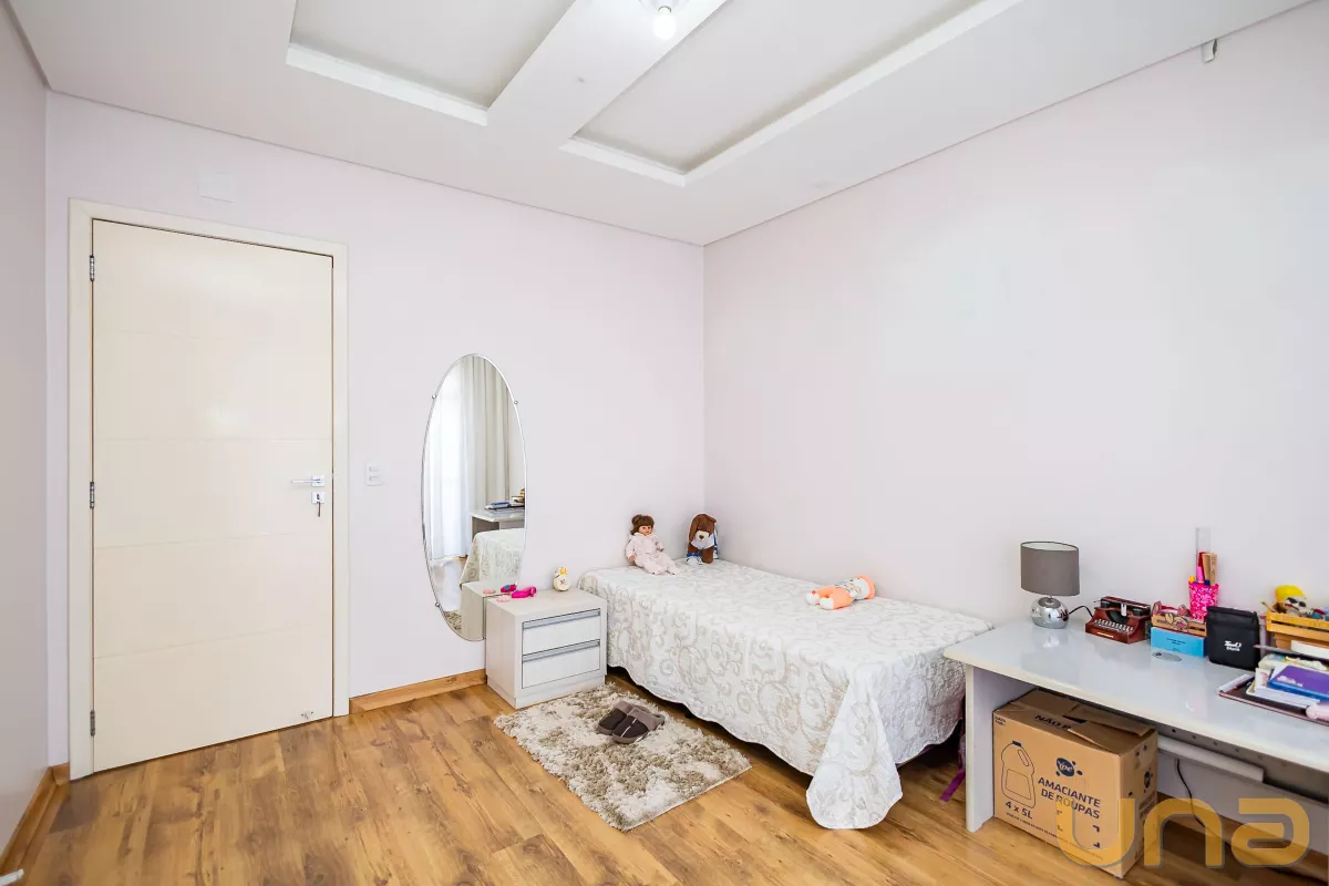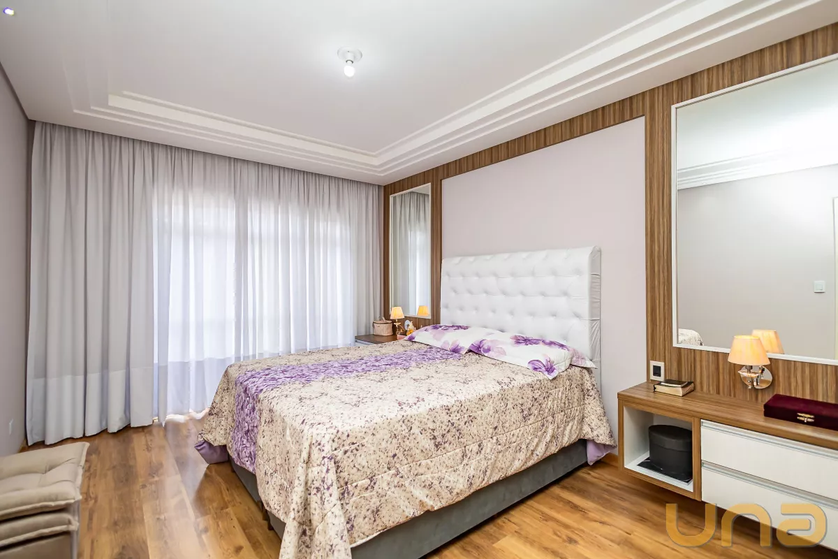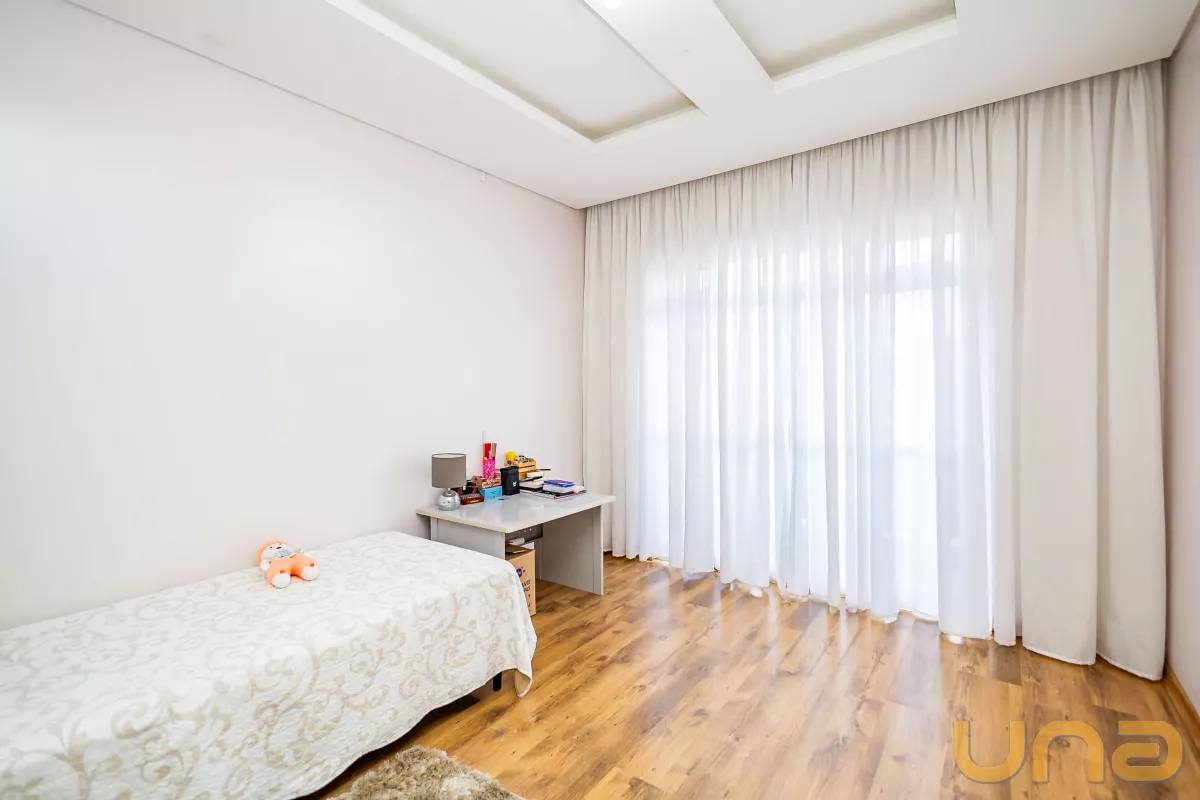 Nos fundos, há um jardim encantador com plantação de uvas, fonte decorativa, árvore e uma edícula com churrasqueira, o espaço ideal para receber amigos e família. A edícula ainda conta com lavabo e lavanderia ampla. A escada com iluminação embutida leva ao segundo andar, onde estão os dormitórios. O primeiro quarto possui sacada com vista para a rua; o segundo conta com armário planejado, cama e mesa de estudos, além da vista para o quintal. A suíte master é um destaque à parte, com sacada, closet com portas espelhadas e banheiro com banheira.