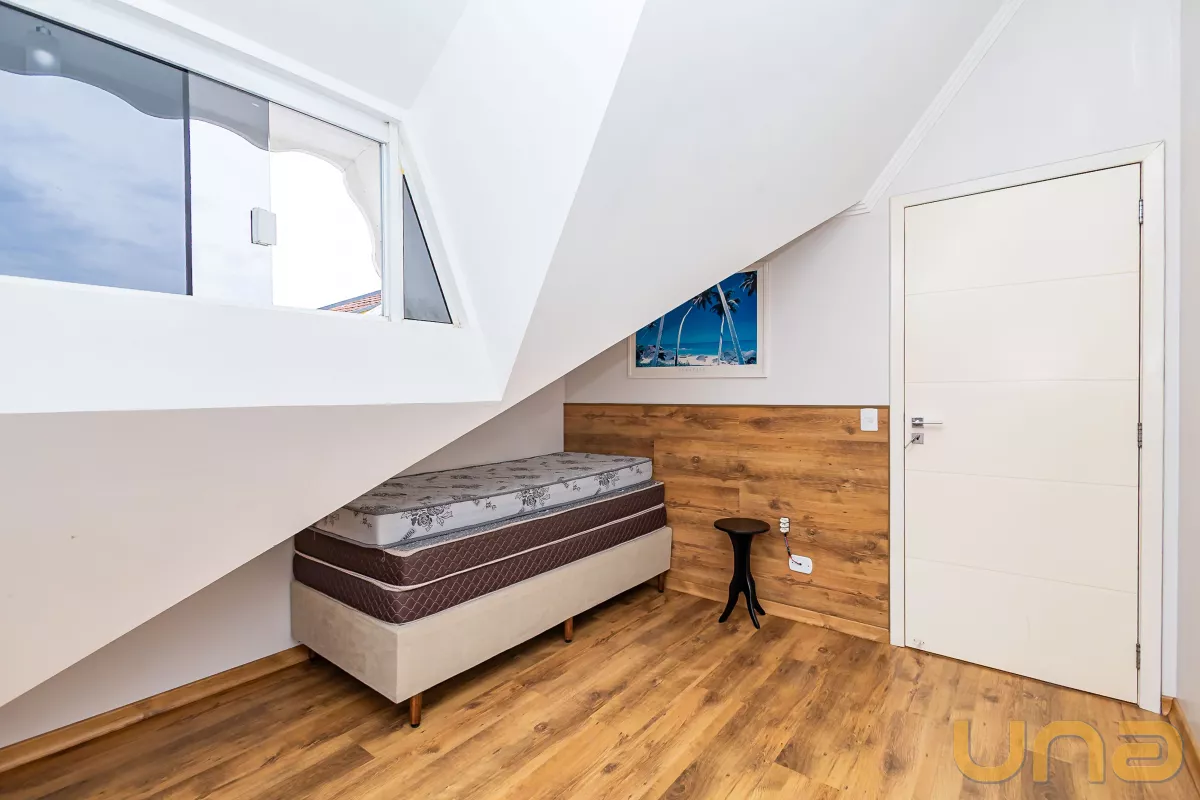 No terceiro pavimento, há um aconchegante espaço com lareira a lenha, sofá, um quarto adicional e banheiro, além da área técnica para a caixa d’água.