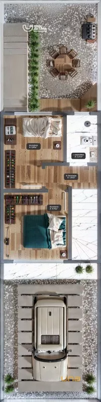 São 48m² de área construída privativa, distribuídos em: 2 Quartos, Sala de estar aconchegante, Cozinha funcional, 2 banheiros sociais, Área de serviço, 1 vaga de estacionamento.
