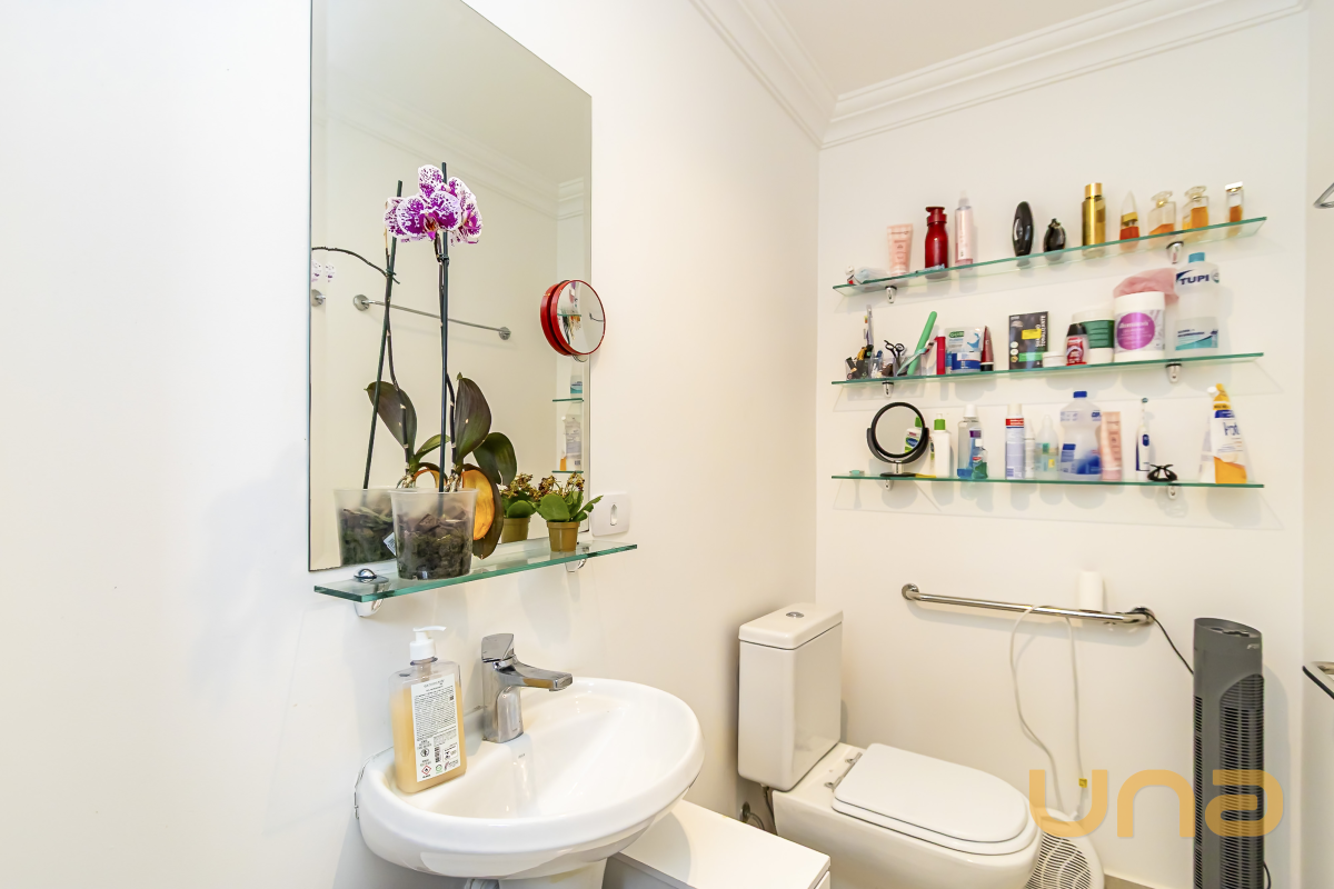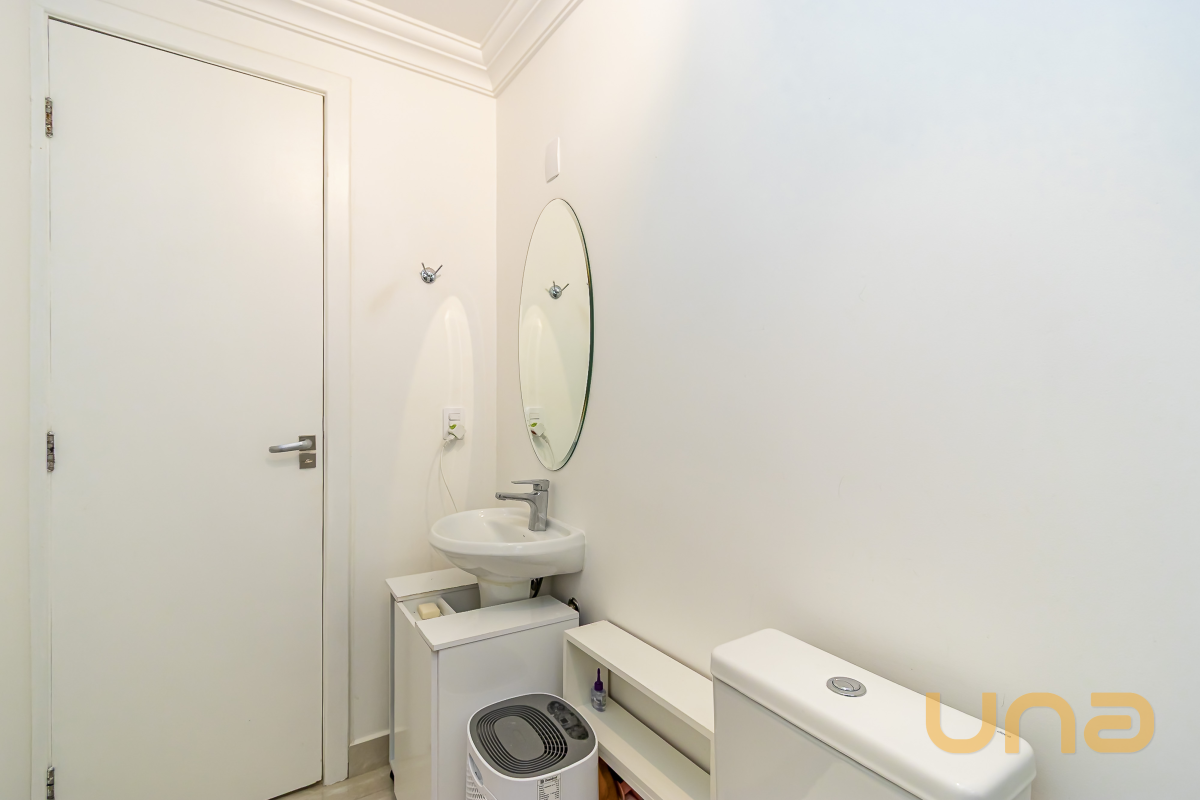 Na área íntima, o apartamento oferece um banheiro social equipado com armários, acessórios, espelho, metais e box. O primeiro quarto possui guarda-roupa embutido; a suíte conta com armários, espelho e box; e o terceiro quarto também está equipado com armários planejados.
