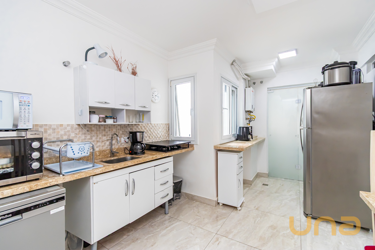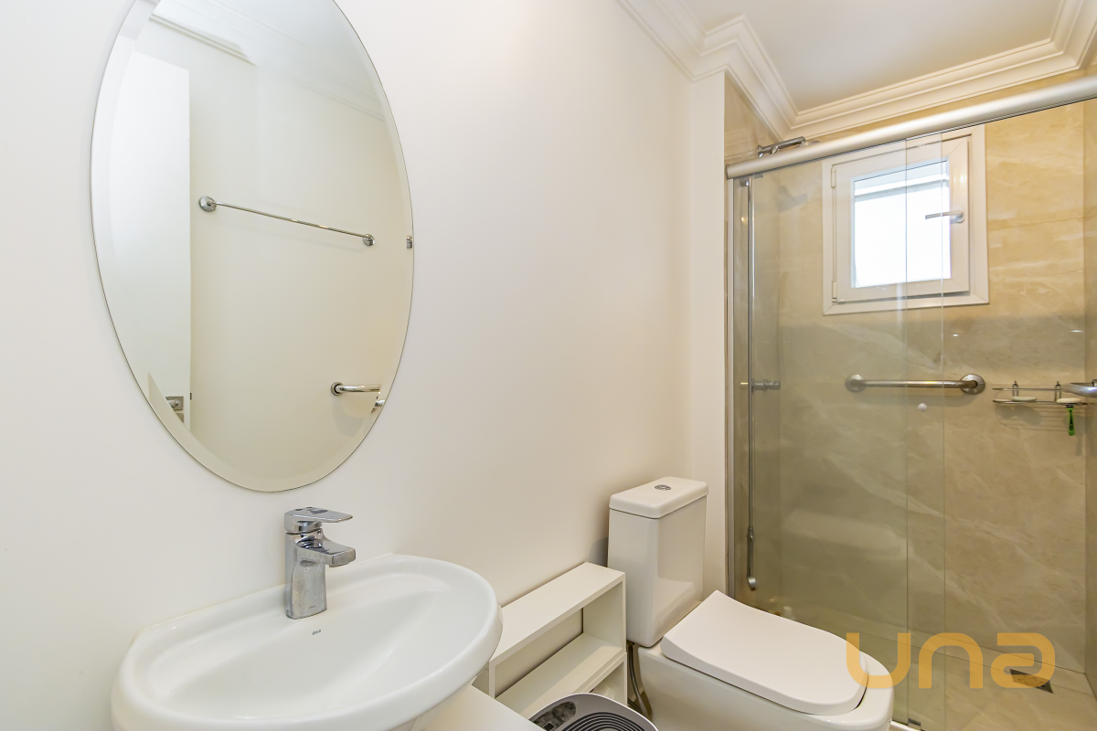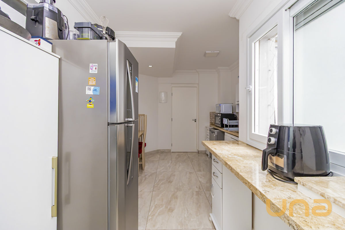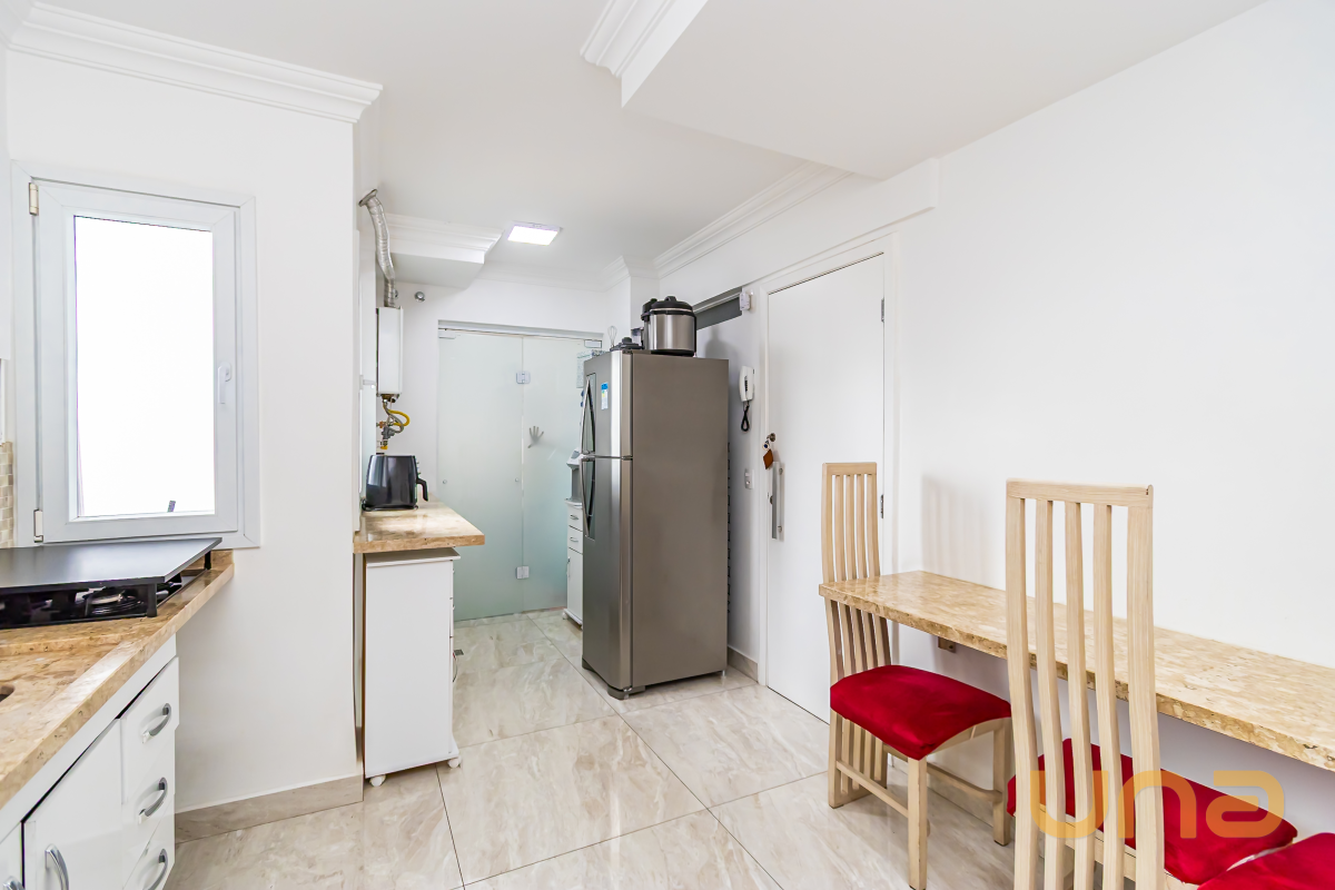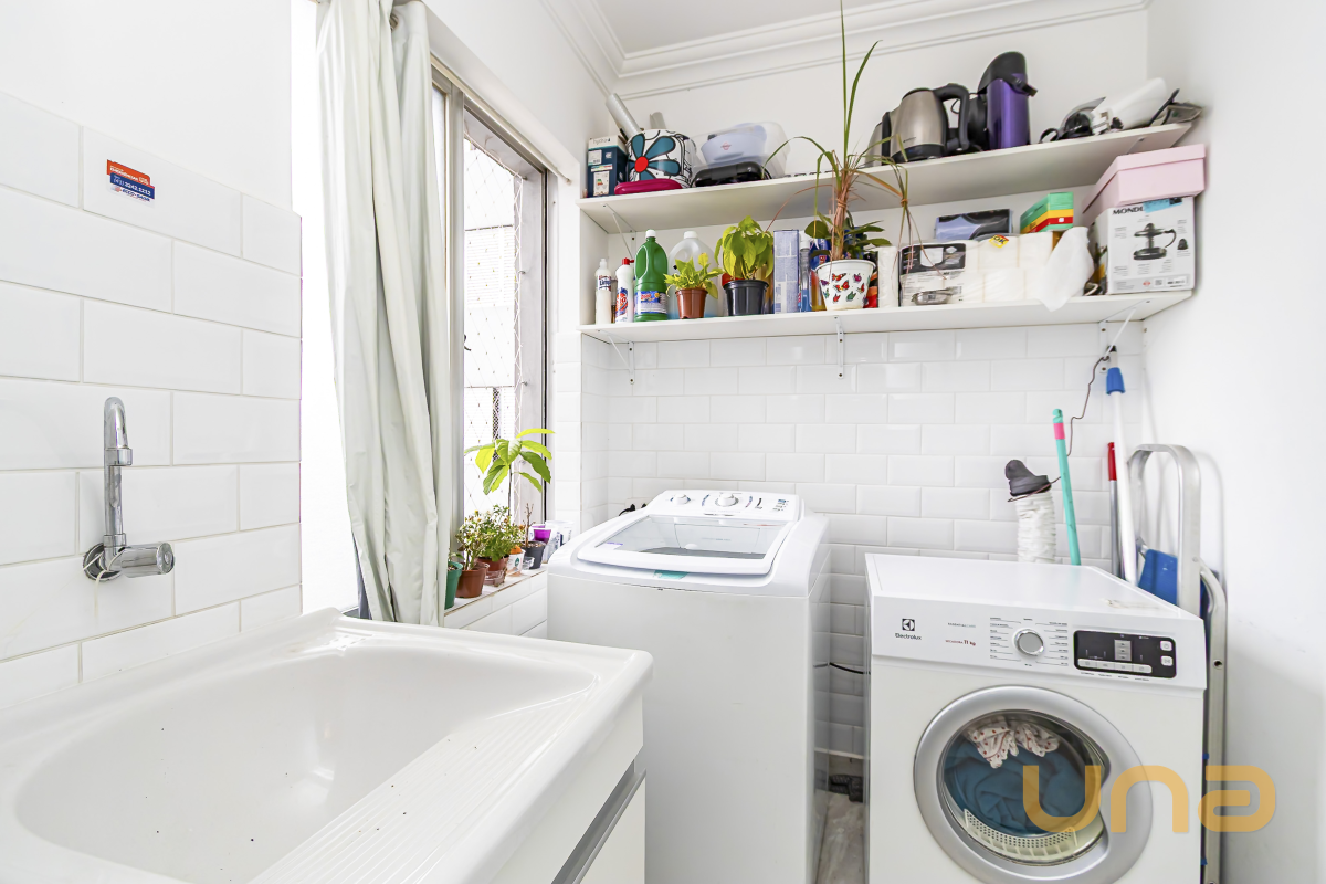 Apartamento com 3 quartos, sendo 1 suíte, e 116 m² de área privativa, distribuídos de forma funcional e confortável. A planta conta com entrada de serviço, cozinha com armários embutidos, bancadas em granito, infraestrutura para aquecimento a gás, além de uma área de serviço com armários e porta de vidro que separa os ambientes. A sala é ampla, comportando dois ambientes — estar e jantar — e possui sacada com fechamento em vidro, proporcionando maior conforto e integração.