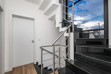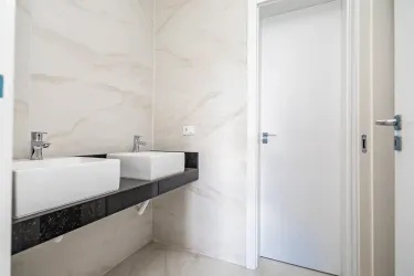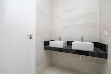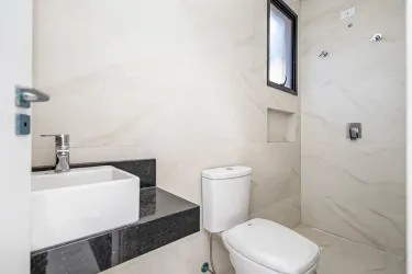 No piso superior, você encontra 3 suítes espaçosas, todas com banheiros equipados com pias em mármore e cuba dupla (ele e ela), garantindo mais conforto e praticidade no dia a dia. A suíte master se destaca com uma charmosa sacada, ideal para momentos de relaxamento.