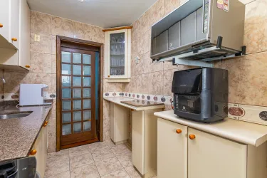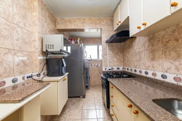 A área social conta com sala para dois ambientes — estar e jantar — com piso em madeira e amplas janelas que garantem ótima iluminação natural ao longo do dia. A planta ainda dispõe de lavabo e uma cozinha espaçosa com armários, integrada à área de serviço.