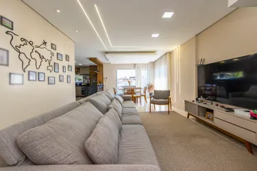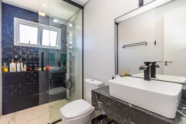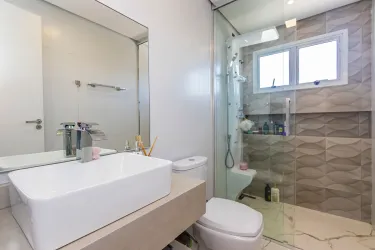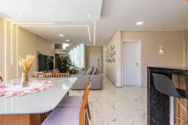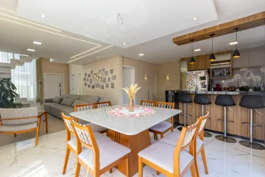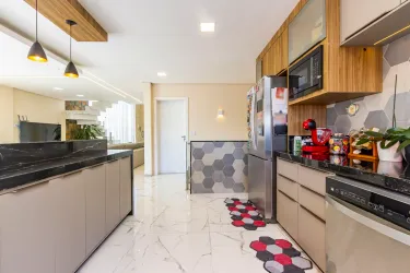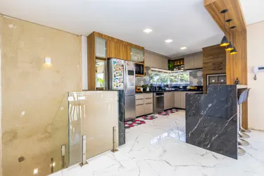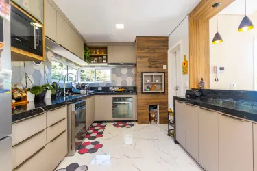 A cozinha é planejada e integrada à churrasqueira, oferecendo mais praticidade e conforto no dia a dia. O imóvel conta ainda com uma área gourmet anexa, com duas portas triplas de acesso, proporcionando excelente iluminação natural e ventilação.