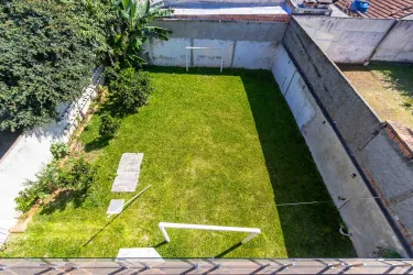 Nos fundos, há um amplo espaço com área gramada e pomar, ideal para momentos de lazer ao ar livre.