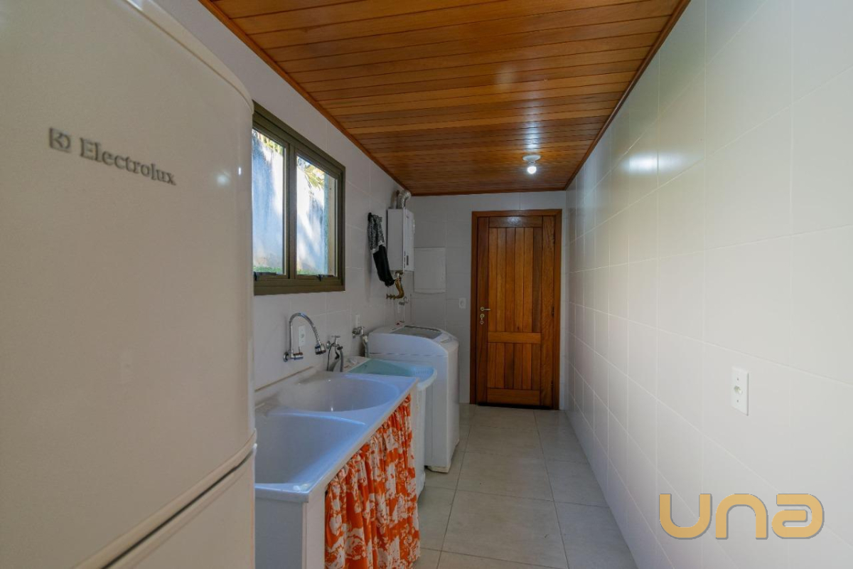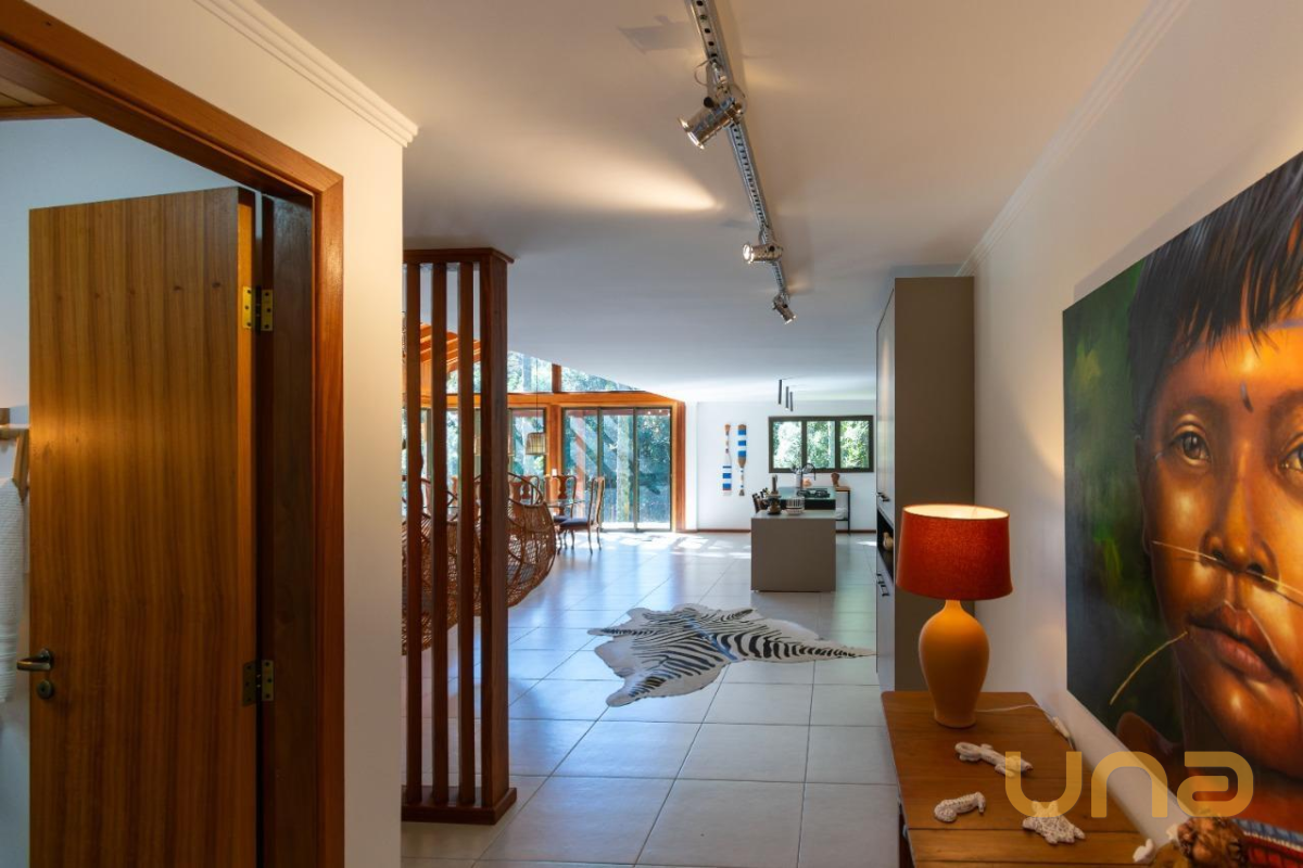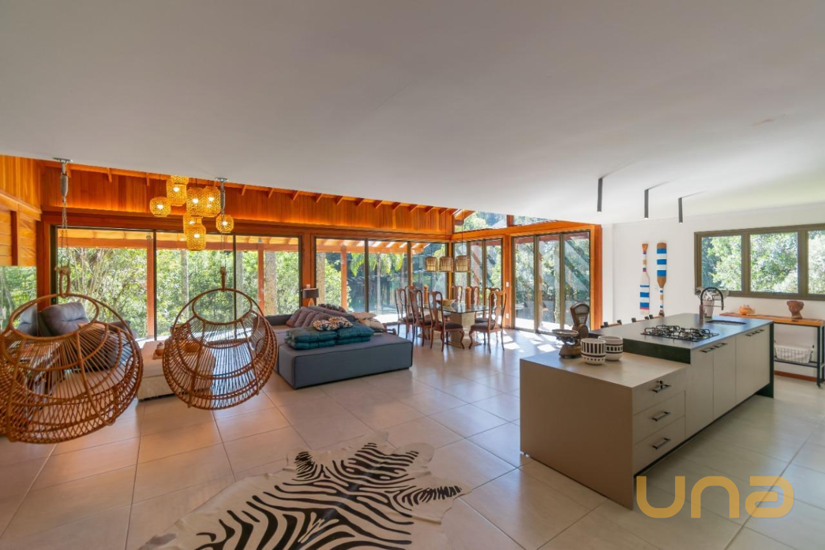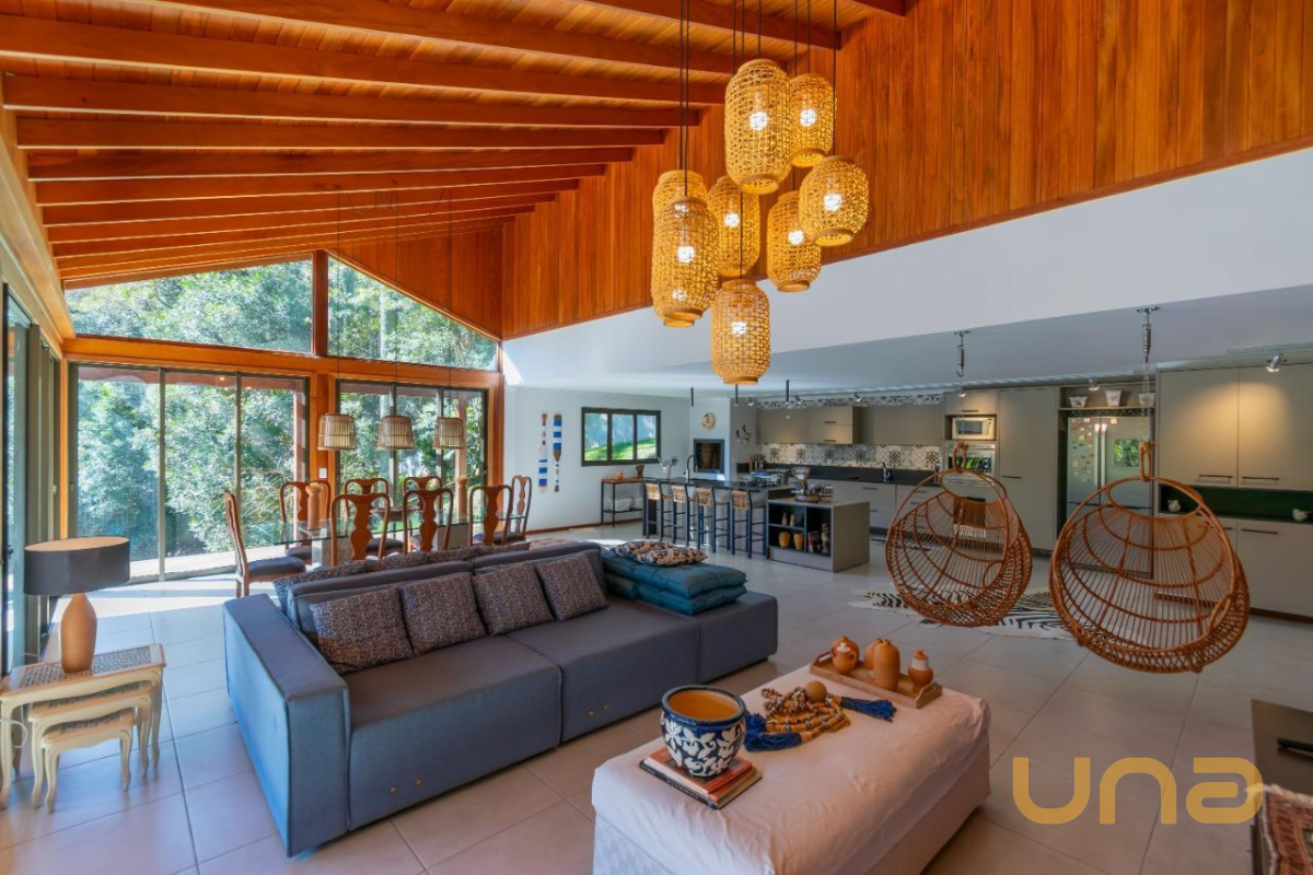 Logo ao entrar, você é recebido por um elegante hall de entrada que se abre para uma sala de estar integrada à sala de jantar e à cozinha americana planejada, com churrasqueira. Todo o ambiente é rodeado por amplas janelas de vidro, que trazem ótima iluminação natural e uma vista deslumbrante para o bosque com um lago privativo e deck.
