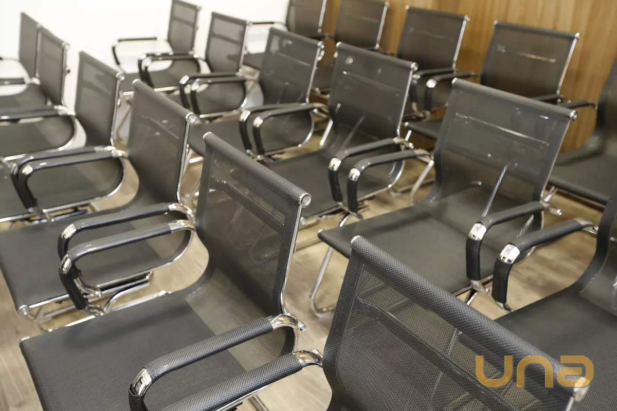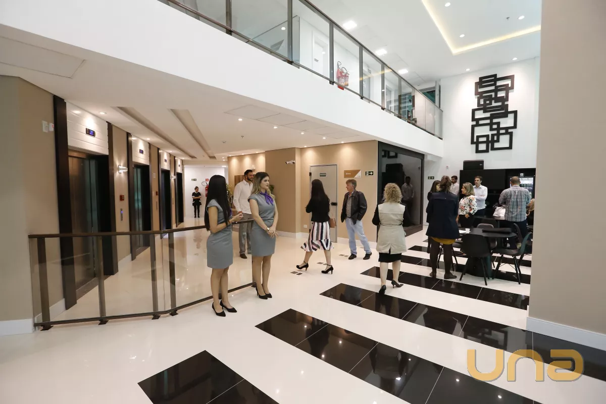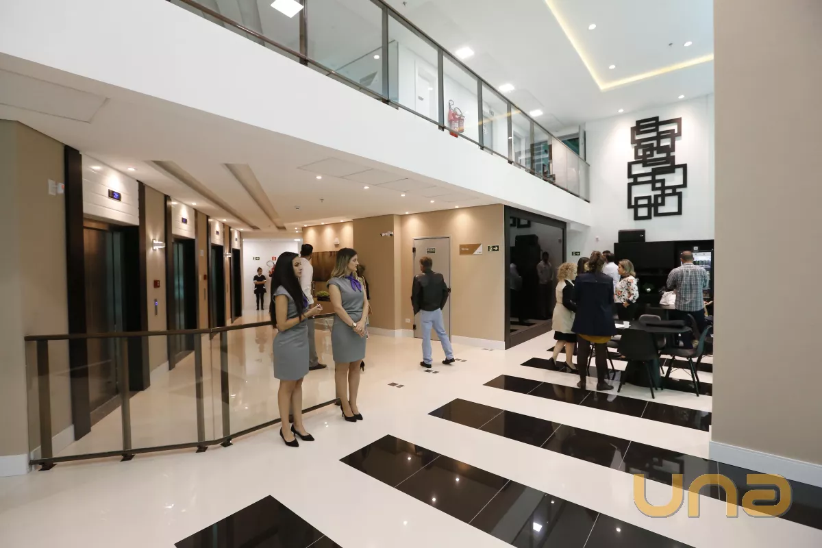 Prédio com hall de entrada; recepção; 4 elevadores; auditório; salas de reuniões.