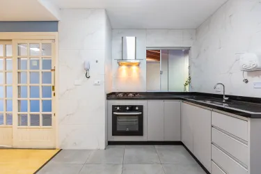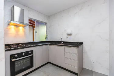 Cozinha com armários planejados, cooktop, forno e exaustor