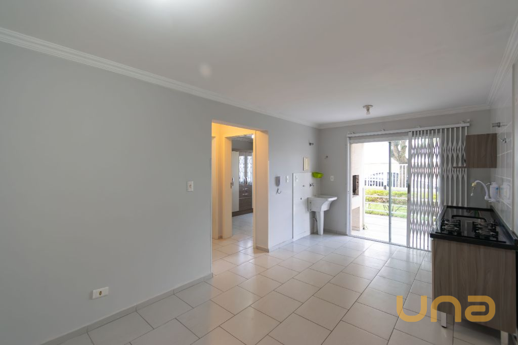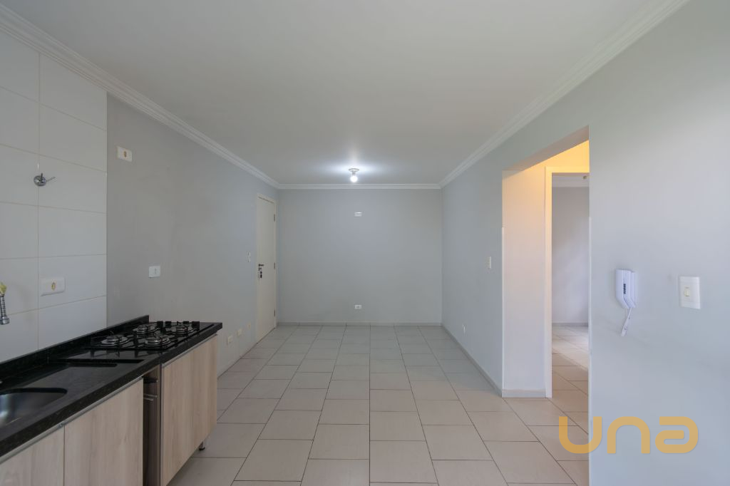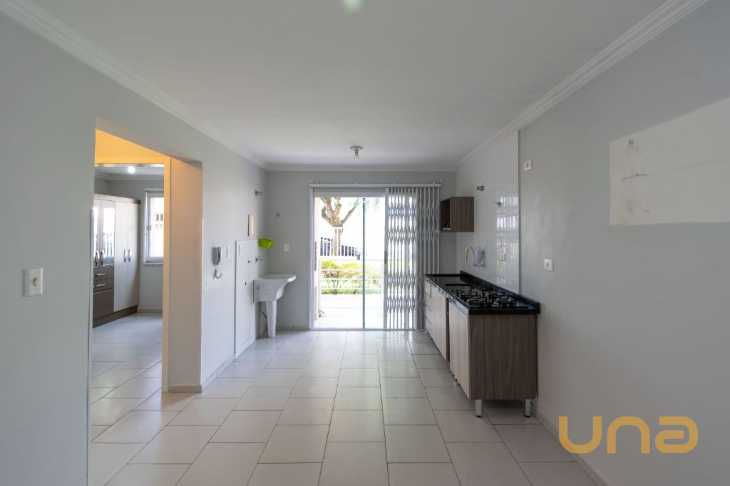 - Espaço de sala de estar e jantar integrados à cozinha com armários