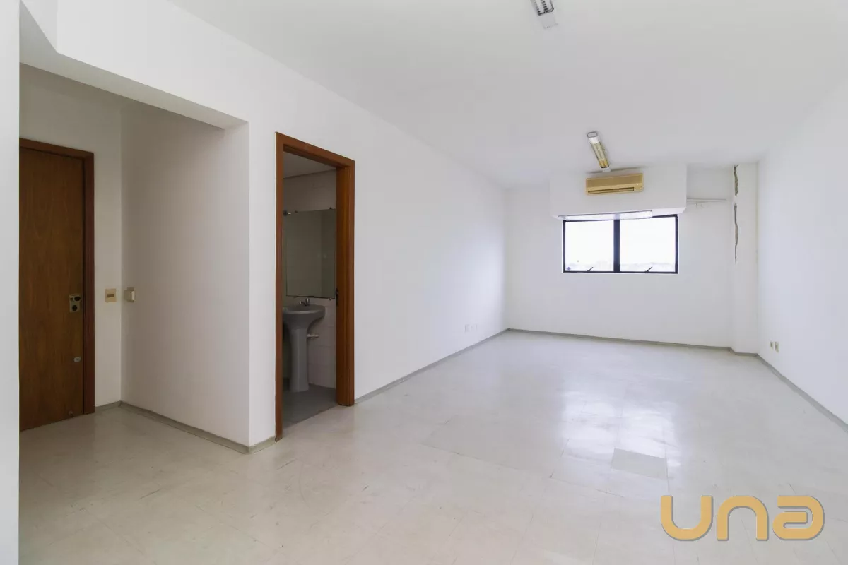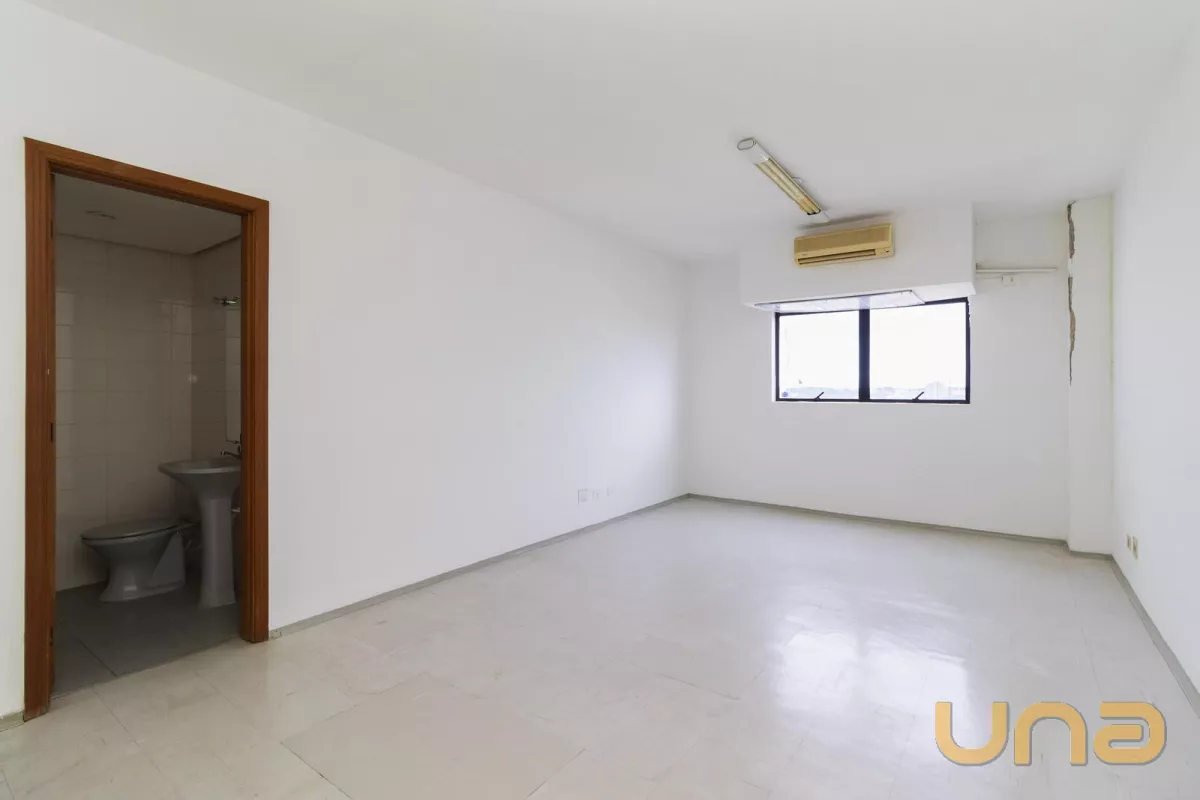 Descrição: Conjunto comercial em andar alto, vão livre, sem móveis, um banheiro com pia e espelho, piso emborrachado, uma vaga de garagem rotativa. Imóvel divulgado para locação por R$ 900,00.